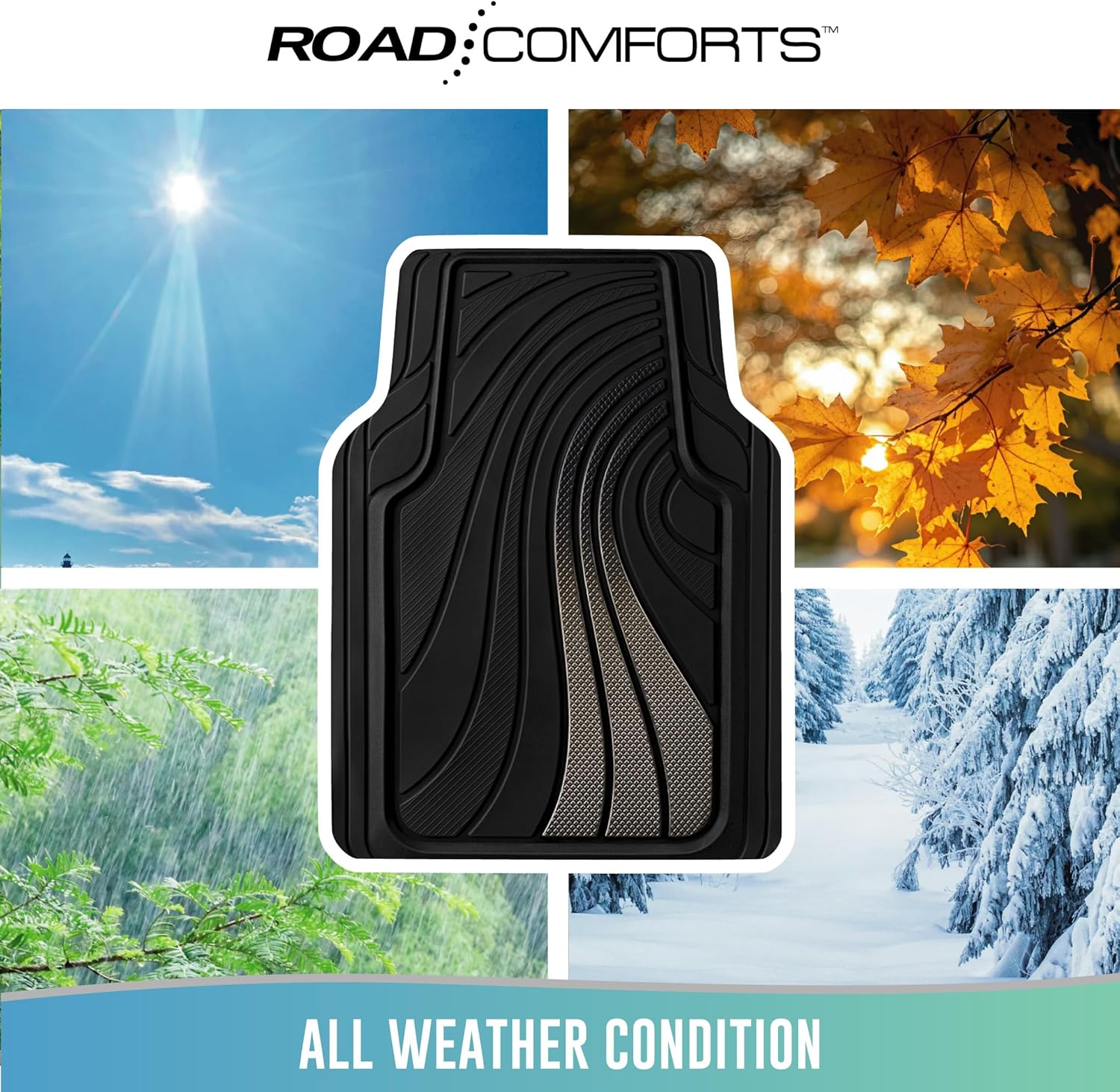 - Premium Construction – Crafted from durable rubber and stylish aluminum film, Road Comforts floor mats are built to withstand daily wear while enhancing your car’s interior. The tough yet flexible materials offer reliable all-weather protection with a sleek metallic touch.