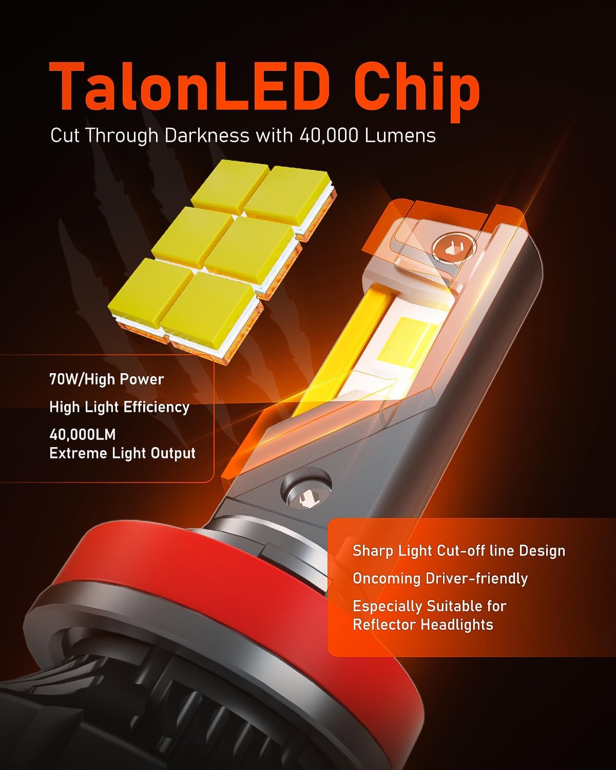 - 140W High Power TalonLED - Each Luxster LED bulb operates at 70W, delivering a combined high power output of 140W. Our Punisher series utilizes cutting-edge TalonLED CSP chip technology, offering unmatched power and efficiency. With the same power consumption, TalonLED outperforms competitors by threefold.