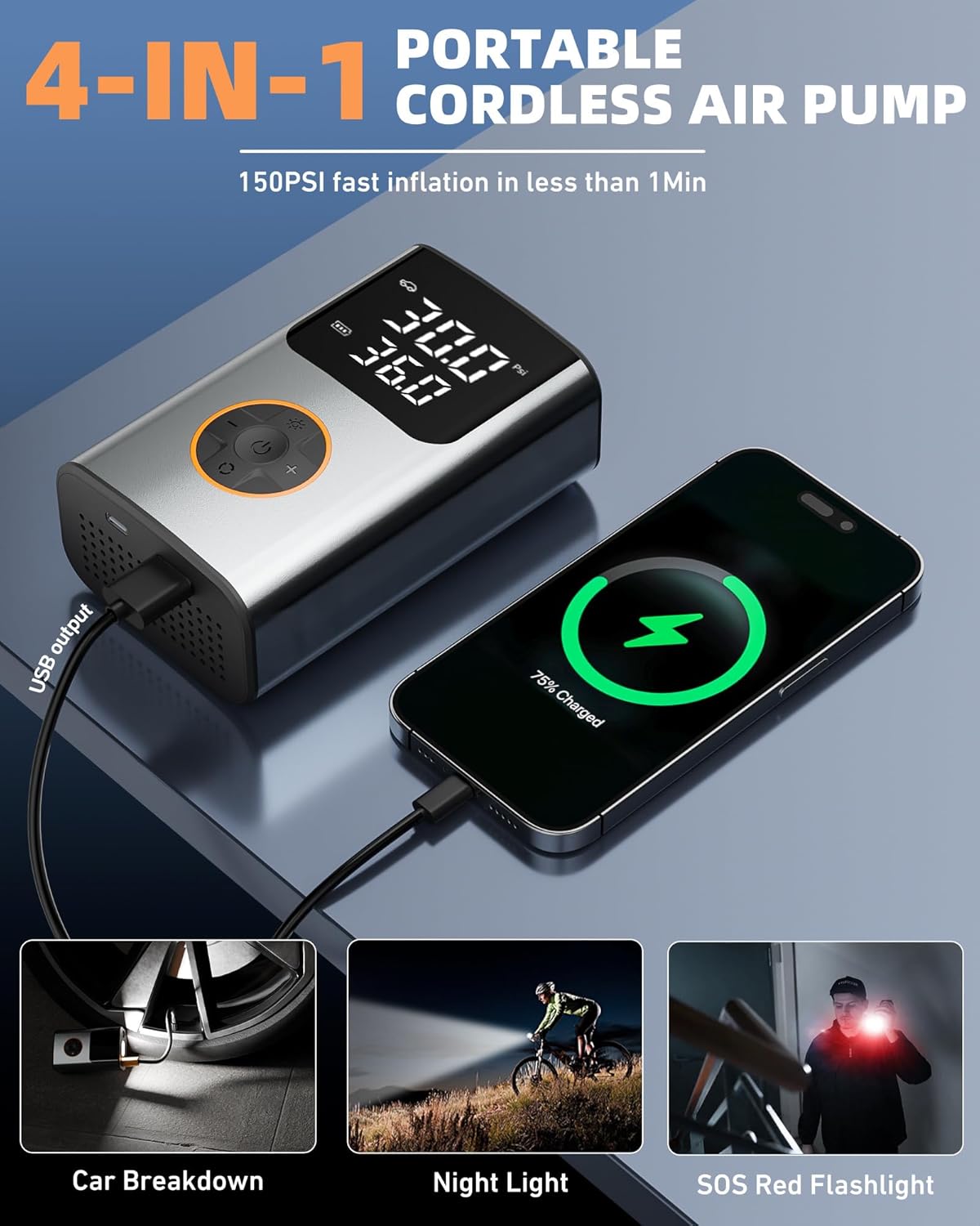 - 【Powerful Output & Faster Inflation】 This Air Compressor powerful motor can provide 150PSI pressure, and 36 L/min air flow. 28-35 tires only need 1min, 0-36PSI only need 5 minutes to fully inflate. With its 5 intelligent modes, it effortlessly caters to a range of inflation tasks. Use with electric bikes, bicycles, motorcycles, cars, balls, and more.