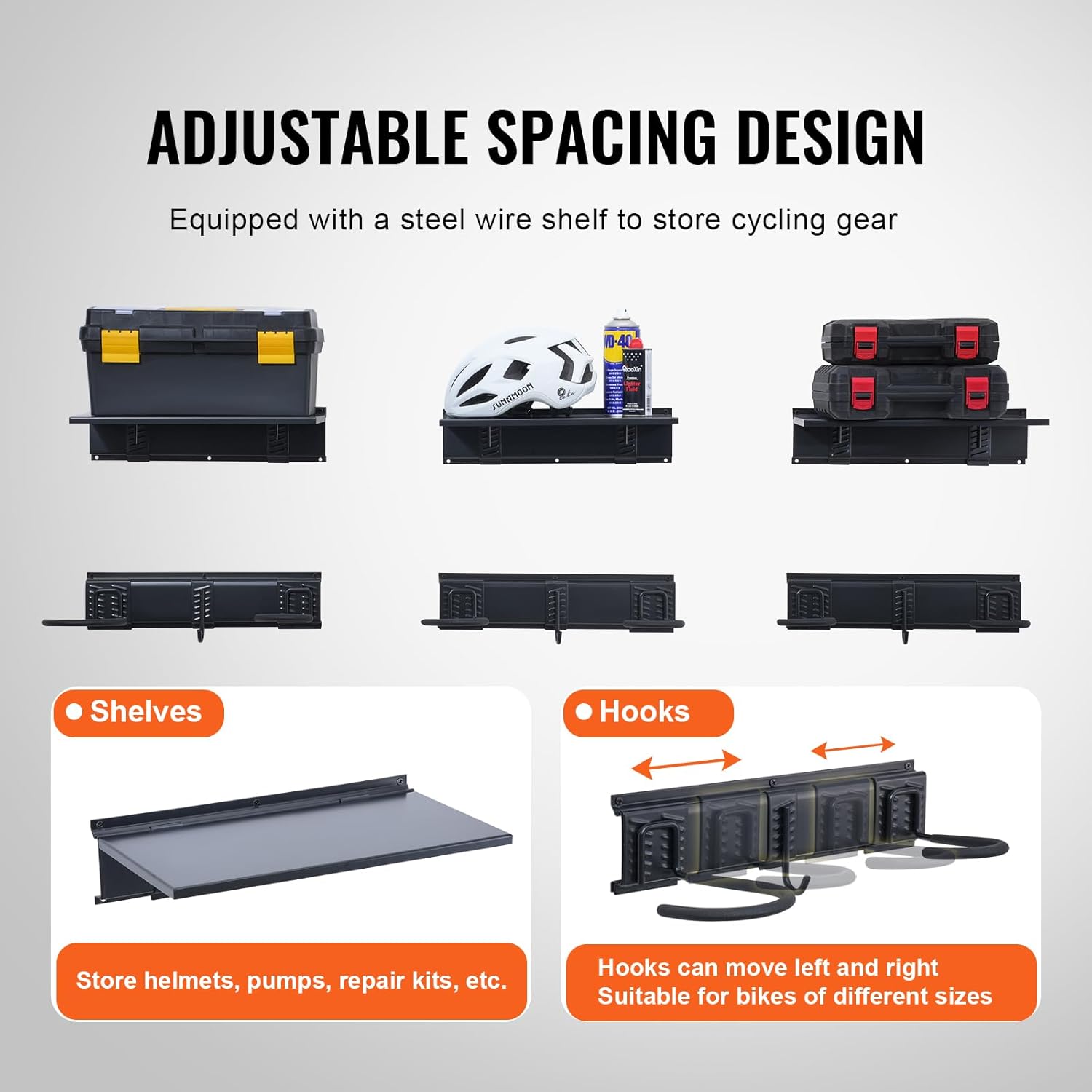 - Adjustable Spacing: The bike wall rack's hooks are attached to the rail with a slot-and-slide mechanism, allowing the hooks to move laterally. This design lets you adjust the spacing between hooks to fit different bicycle types. Plus, the rack is equipped with shelves for storing helmets, pumps, repair kits, etc.