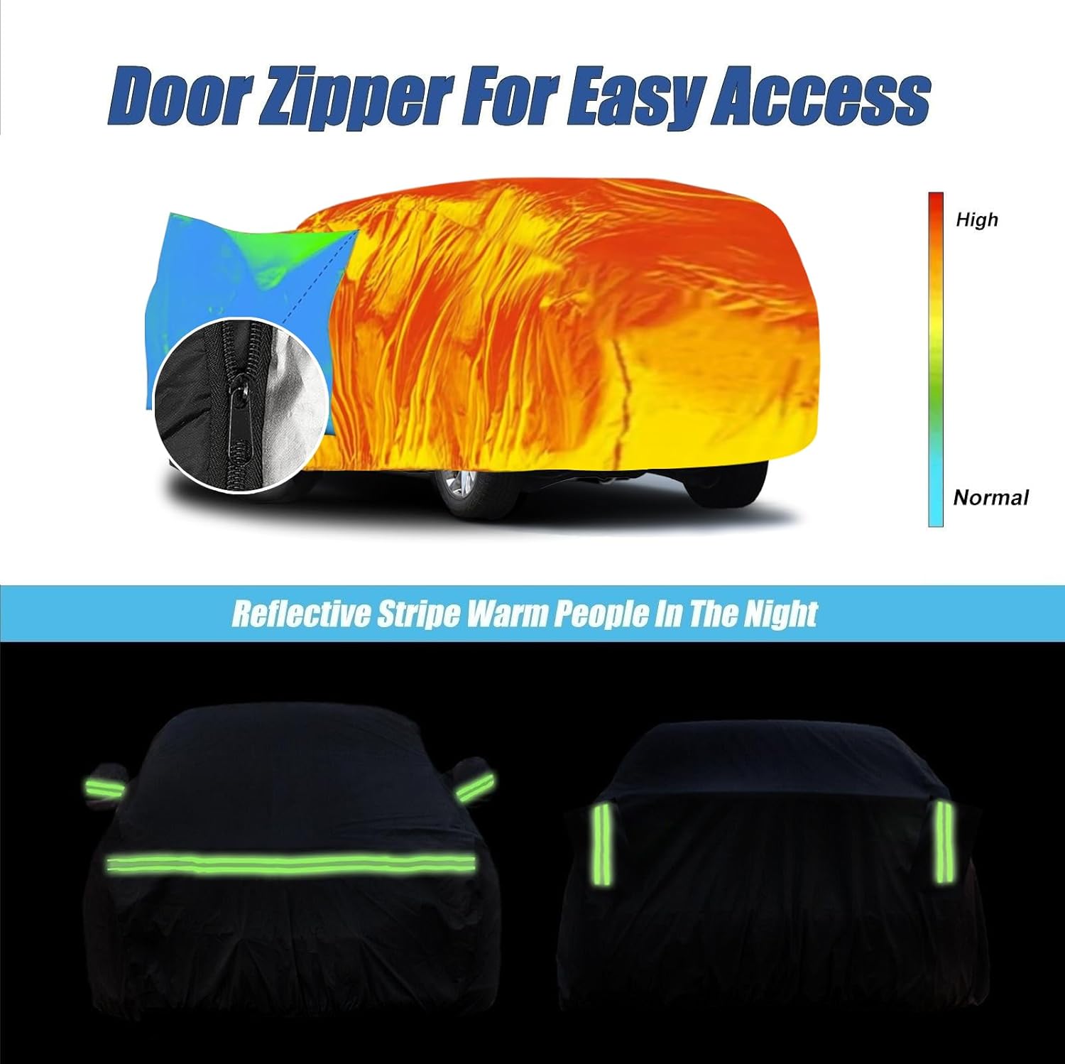 - ăDriver Side Zipper DesignăOur car cover features a convenient driver's side zipper design for easy access. Additionally, it is equipped with night reflective strips on the surface for increased visibility at night, helping to prevent accidents. Mirror pockets are included to protect your mirrors from damage. Windproof straps ensure that the car cover remains secure even in windy conditions. It also comes with a combination lock to keep your cover securely fastened under your vehicle.