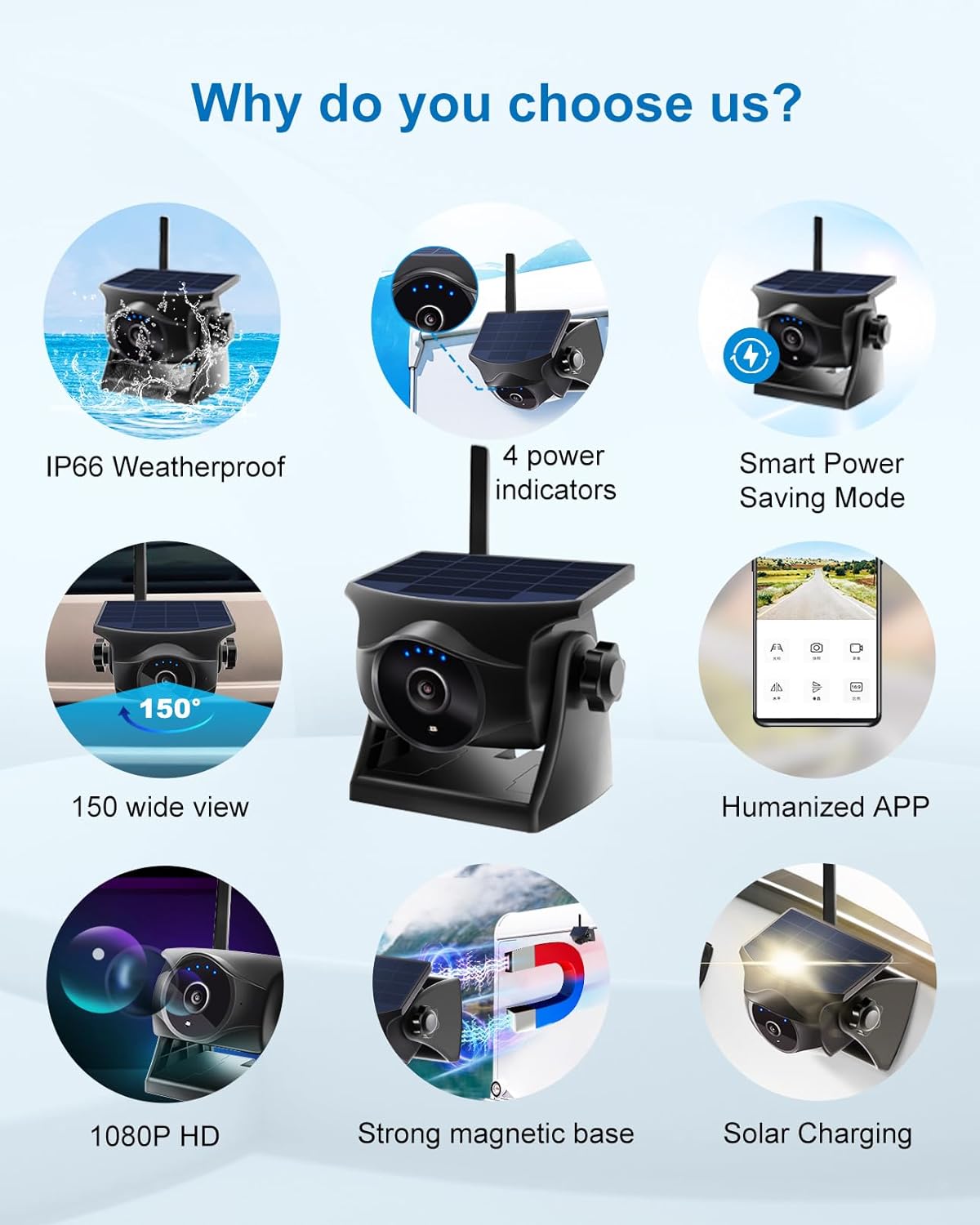 1080P Solar Wireless Backup Camera, Magnetic WiFi Hitching Camera, Night Vision,365 Days Standby, Rechargeable Battery, Rear/Front View for Horse Trailer Pickup RV Car for Phone Pad Android