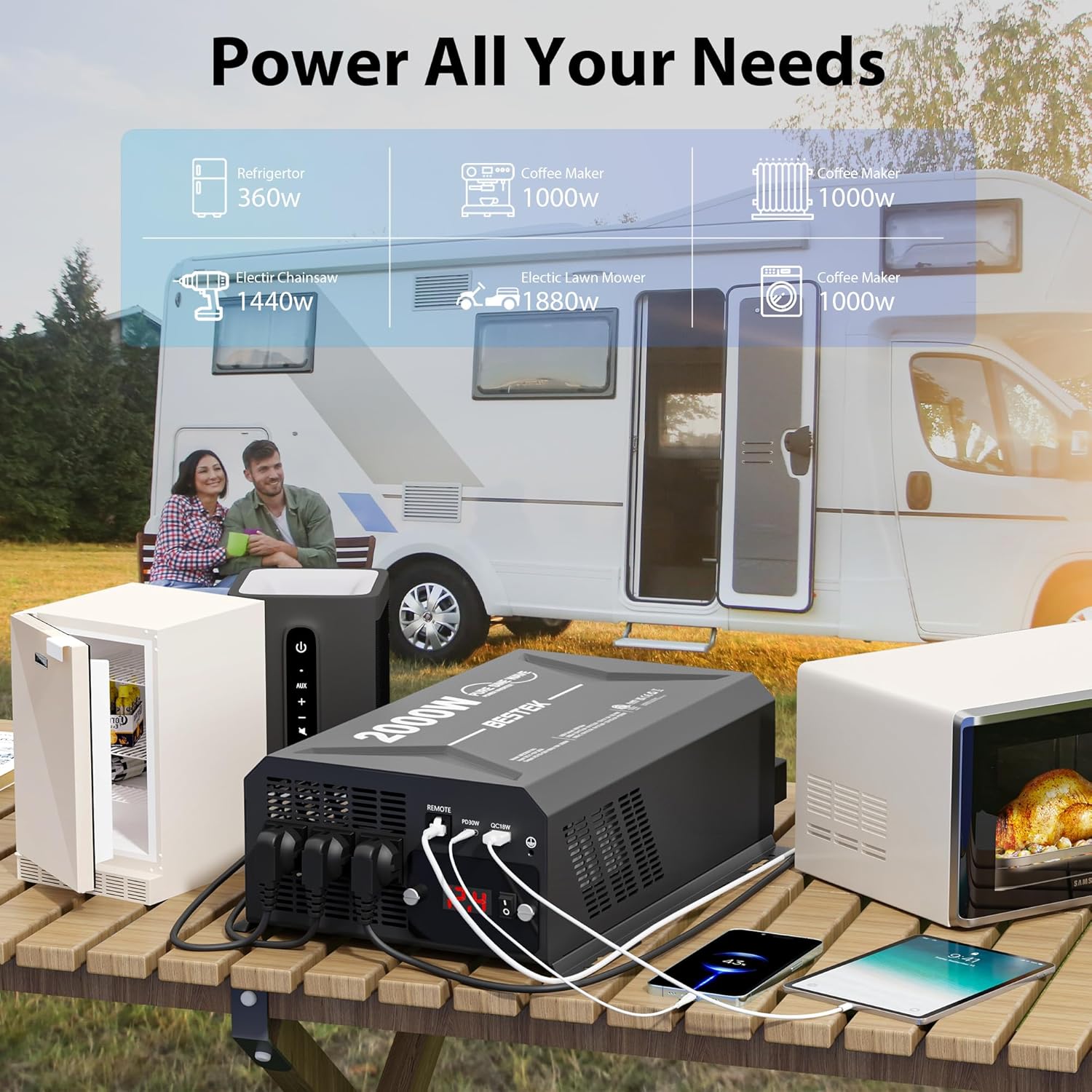 - Multiple Outlets & Compatible with All Battery Types: 2000 watt pure sine wave inverter comes equipped with 3 standard U.S. AC outlets, USB-A(QC18W) and Type-C(PD30W) fast-charging ports. It is compatible with all types of 12V batteries, catering to your various power needs whether you're on an RV trip, camping, road tripping, living off-grid, or in an emergency situation, providing stable power supply. It is suitable for all U.S. electrical appliances, up to 2000W. with an impressive conversion efficiency of over 90%