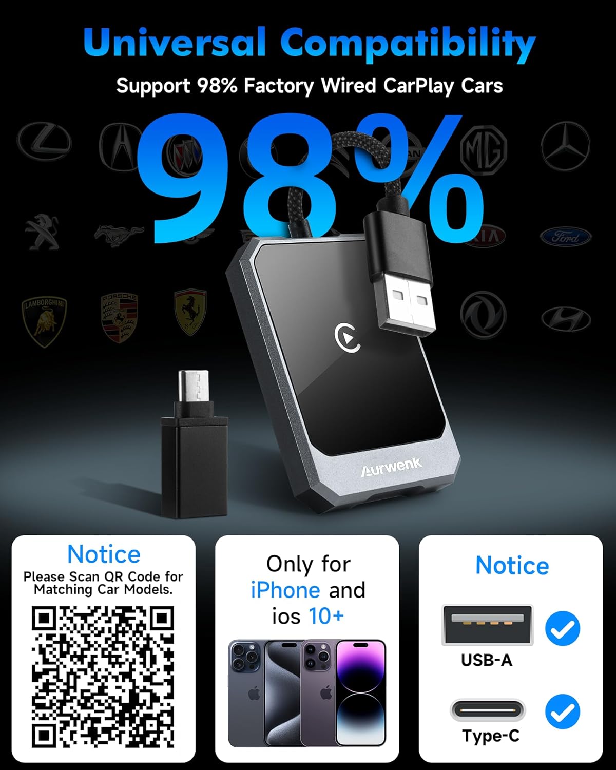 - Wide Compatibility & Reliable Support: Our CarPlay wireless adapter works with vehicles having factory-installed wired Apple CarPlay since 2016 and iPhone models (iOS 10+). We offer a 365-day warranty and lifetime technical support for your peace of mind. Embrace wireless CarPlay driving fun. Upgrade your car now
