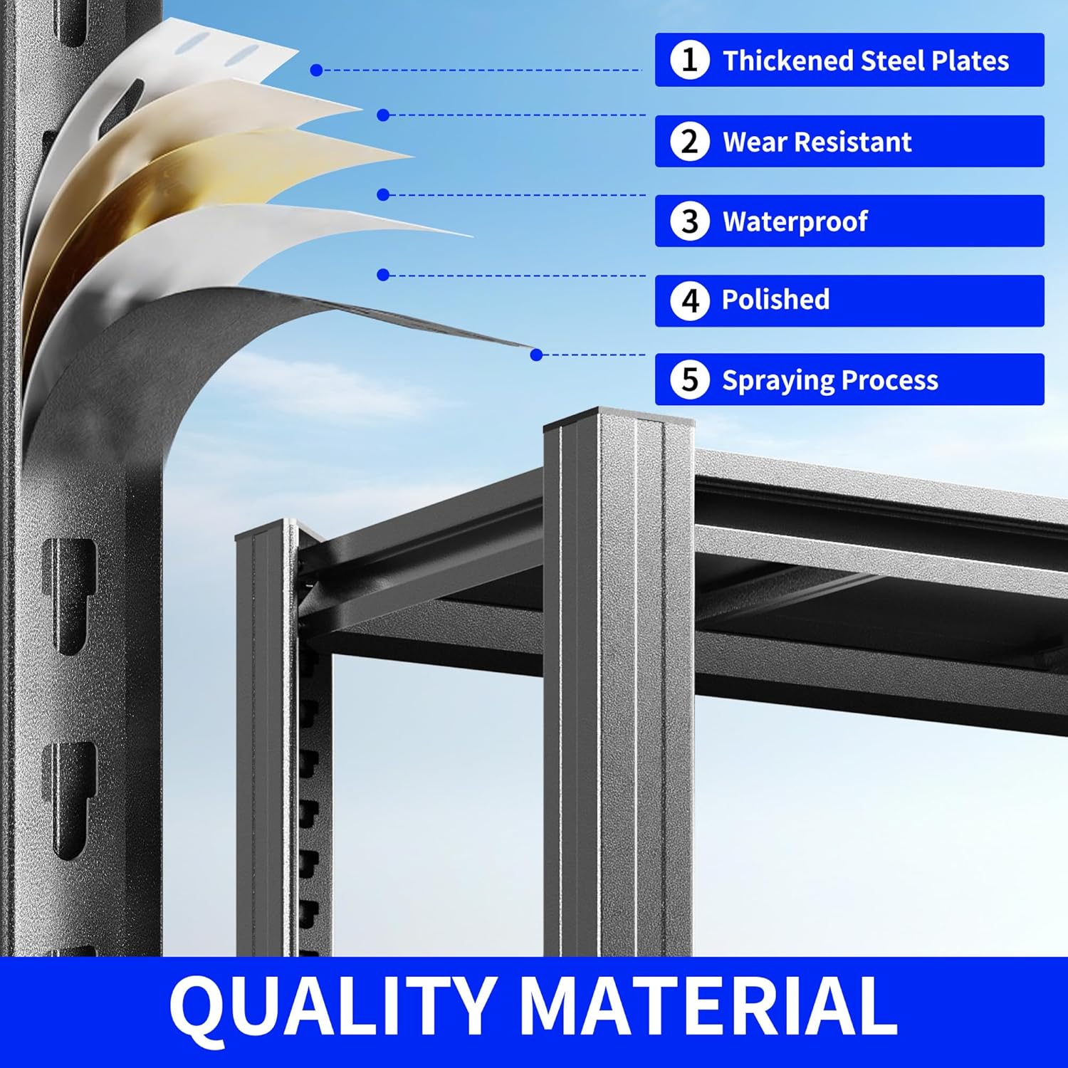 - 72''H*48''W*24''D Heavy Duty Storage Shelves:This garage storage shelves is made of superior quality cold rolled steel, and the surface of the metal shelves is powder coated, waterproof and fireproof. Higher and wider storage shelves to meet your large capacity needs.