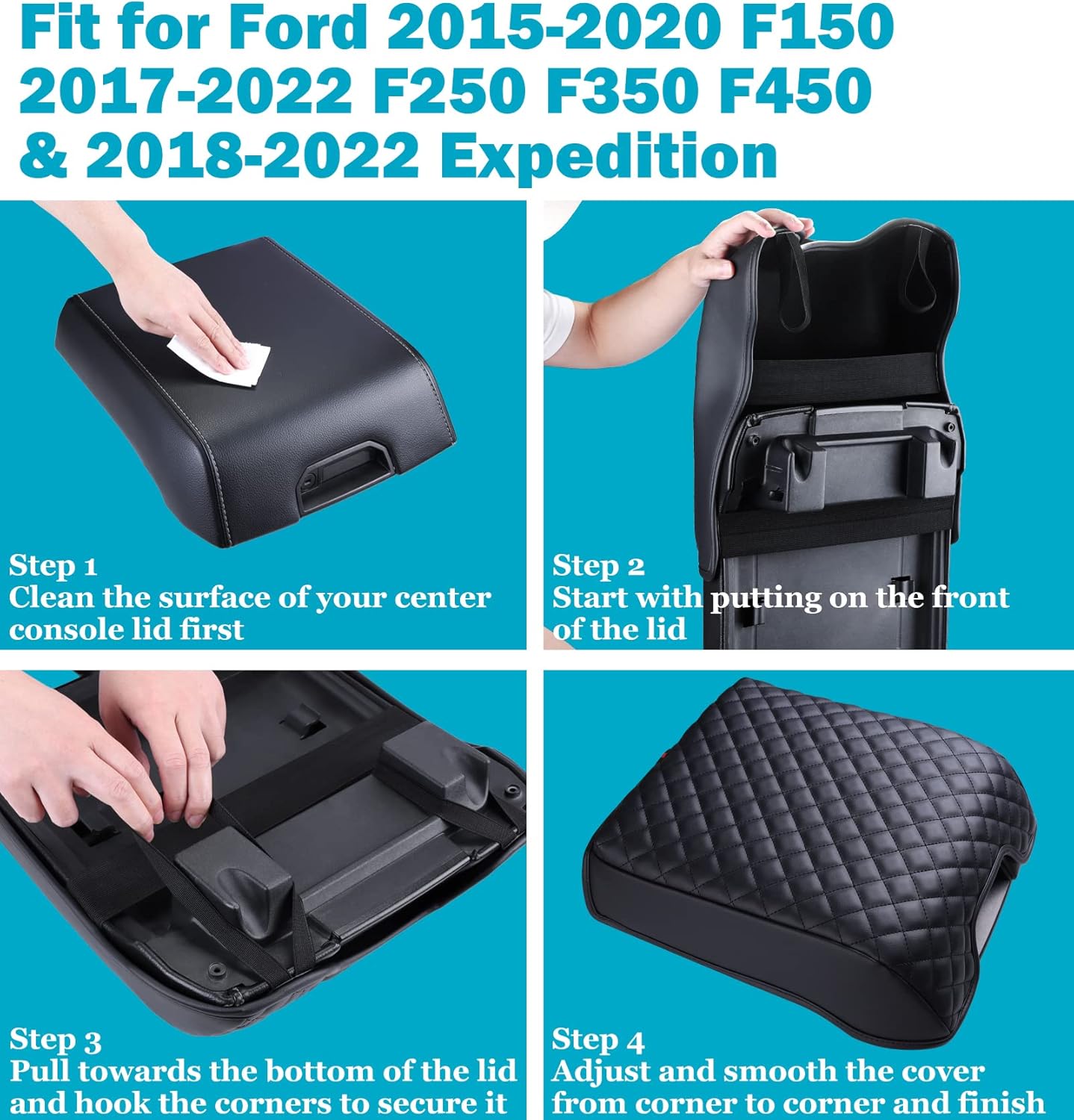 - EXQUISITE WORKMANSHIP -- Our Ford F150 center console cover adopts advanced stitching technology to sew the classic diamond pattern, which makes your carโs armrest box look luxury. The black PU leather cover is like an OEM part that matches perfectly with your car interior, and raises the look of the cab to another level