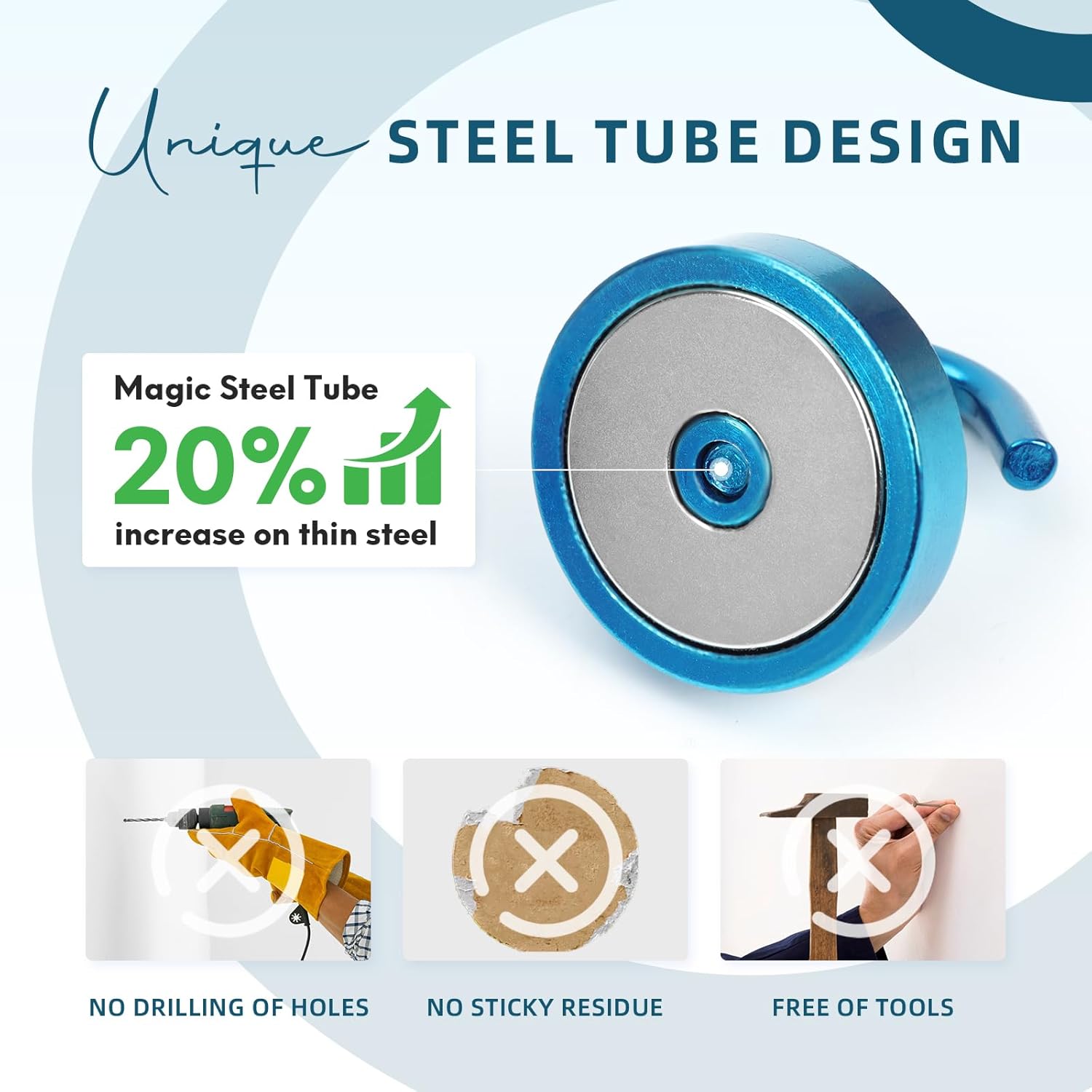 - ✔MAGIC STEEL TUBE DESIGN - Unique design of steel tube inside the base of magnetic hooks greatly increases the attractive force , especially on thin steel! It increase approximately 20% force comparing those none-tube magnets. it solves the problem of weak force on thin steel. Permanent magnetic hook with magic steel tube, strong magnetism lasts forever!