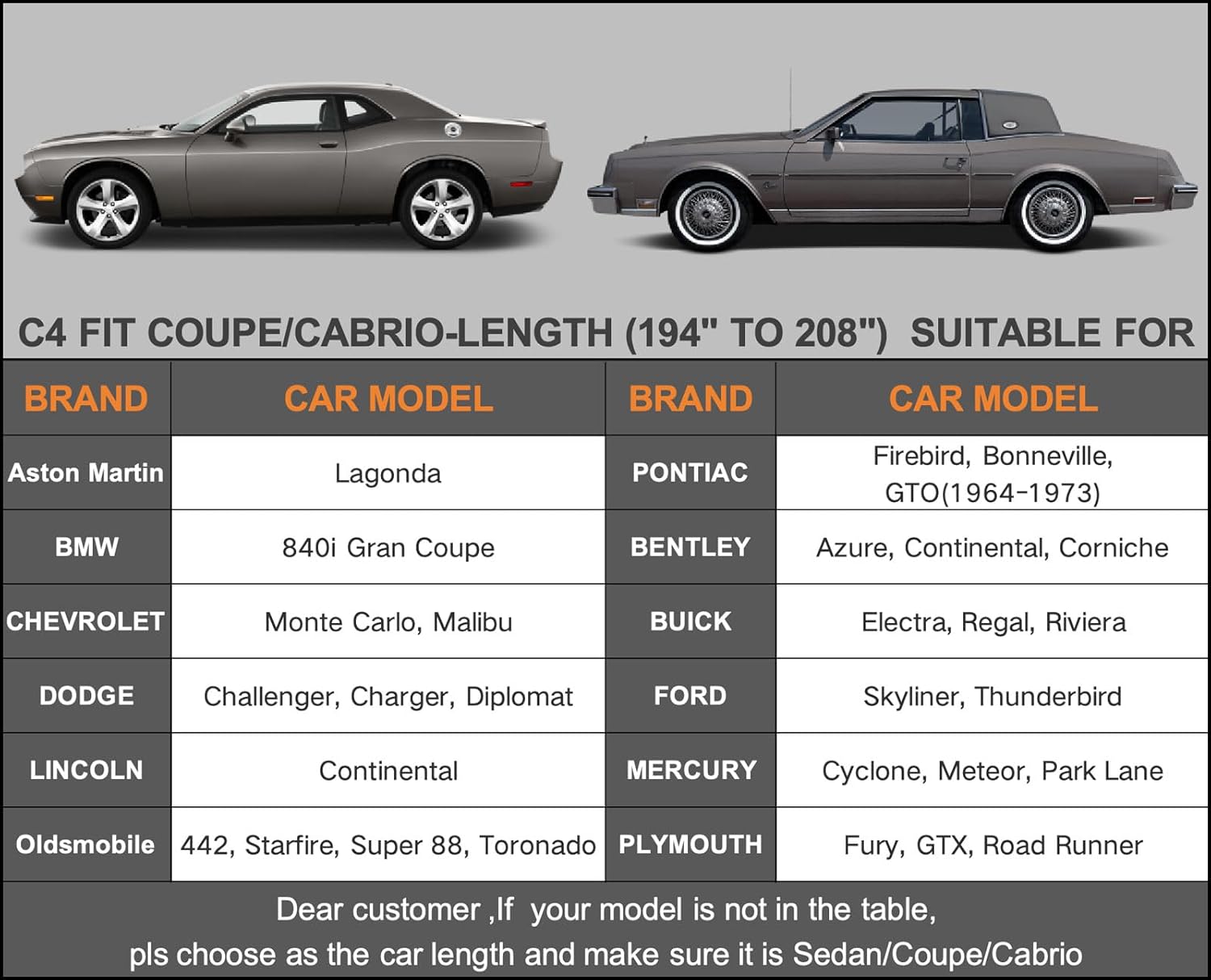 - ăDimension C4ăUniversal fit for sedan/Coupe/Cabrio which length is 194-208 inch (Not for hatchback and SUV ). Suitable for Dodge Charger/Challenger, Pontiac Firebird, Trans AM, Ford Thunderbird Chevy Monte Carlo, Malibu, etc.