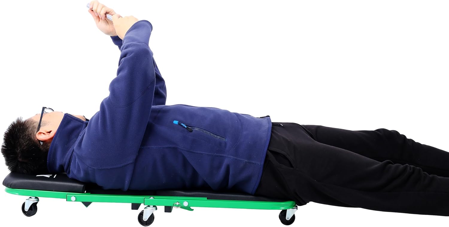 - Heavy-Duty Mechanic Stool: Constructed from a thick tubular steel frame, this creeper seat supports up to 300 lbs. Its sturdy design ensures stability, preventing deformation, rolling over, or tilting backward.