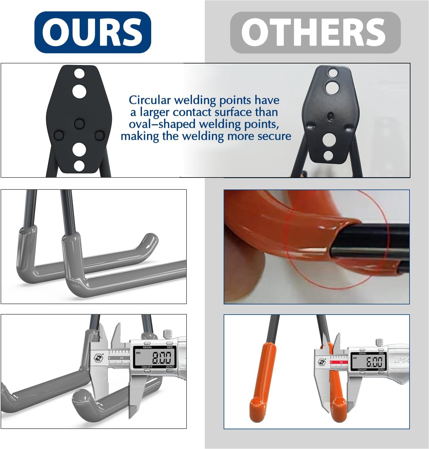 - Upgrade Design for Garage Storage Hooks: Different from other similar garage hooks heavy duty with oval-shaped welding points, our designed circular welding points. These provide a larger contact surface between the hook and the backboard, offering higher security. With this design, thereβs no need to worry about the rear steel panel splitting or falling off, a perfect choice of wall hooks for hanging heavy duty