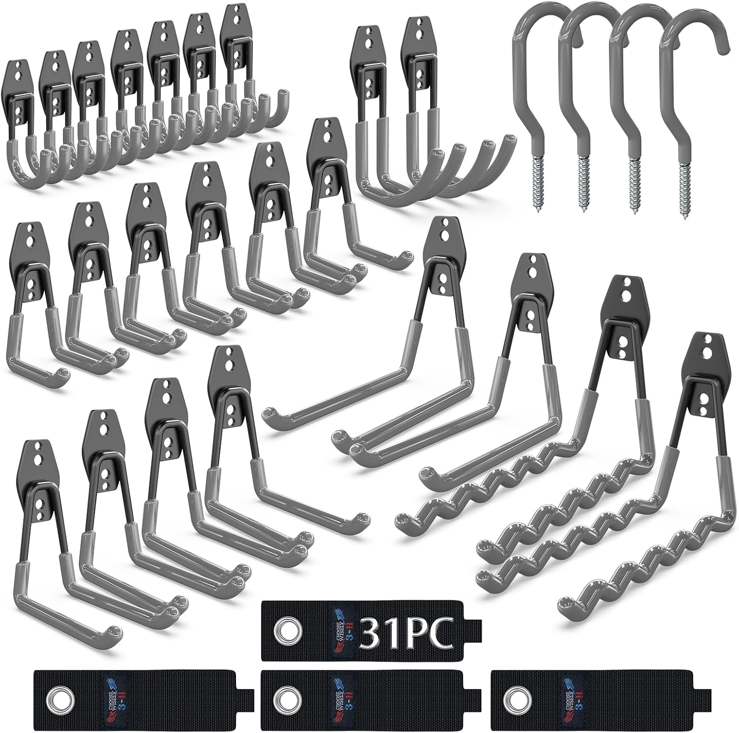 3-H Garage Wall Hooks 31 Pack, Garage Hooks Heavy Duty with Extra Welding Spots, Garage Organizer for Garden, Lawn, Yard Tools, Chairs, Ladders, Weed Eater, Shovel, Blower(Gray)