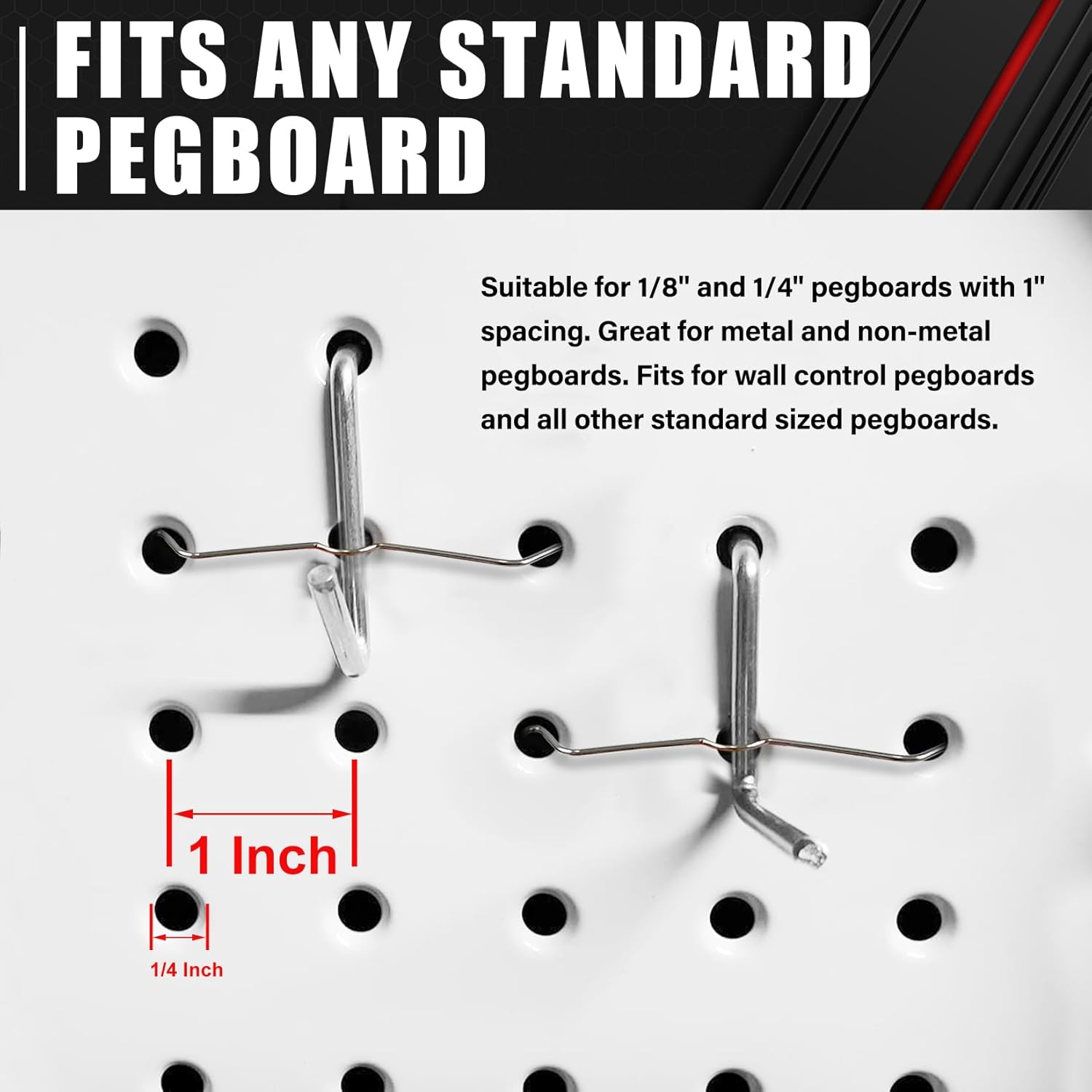 - 【Universality】Our pegboard hook kits are designed for versatility. Fits 1/8“ and 1/4” pegboards with 1” spacing. This universal mounting system ensures that your hooks, bins and hangers remain secure and accessible in any setup.