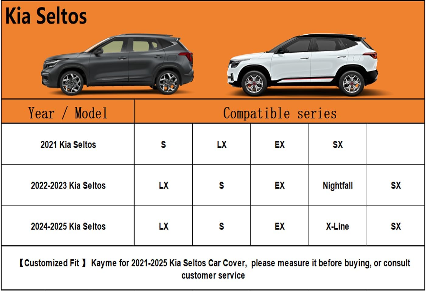 - Coverage : SUV, Full Exterior Coverage, Kia Seltos (2019-2025)