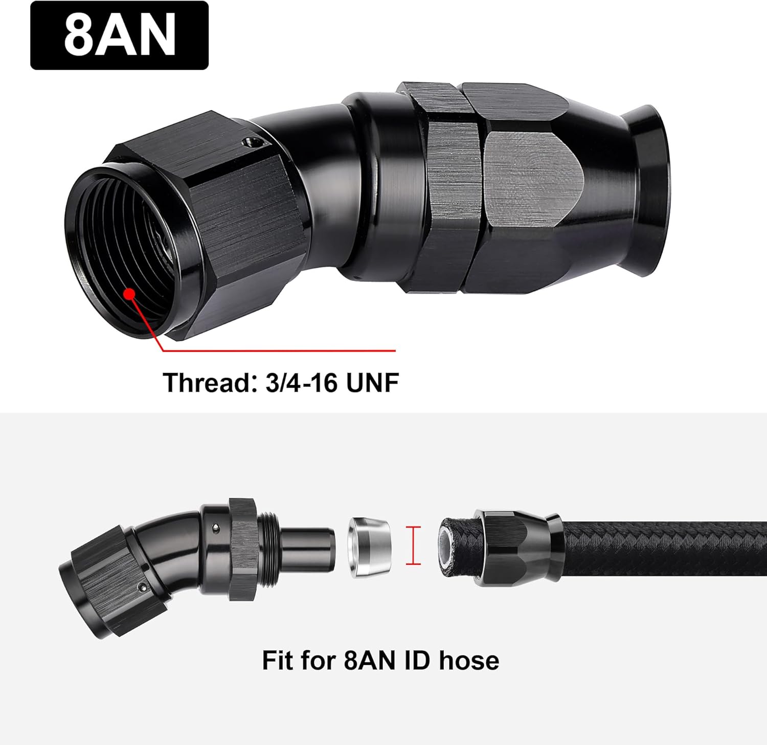 - [Product Size & Parameter] Size: 8AN. Thread Size: 3/4-16 UNF. Working Pressure: 1500PSI. Working Temperature Range: -40Β°F-250Β°F. Angle: 30 Degrees. Note: Please verify the hose size before purchase.