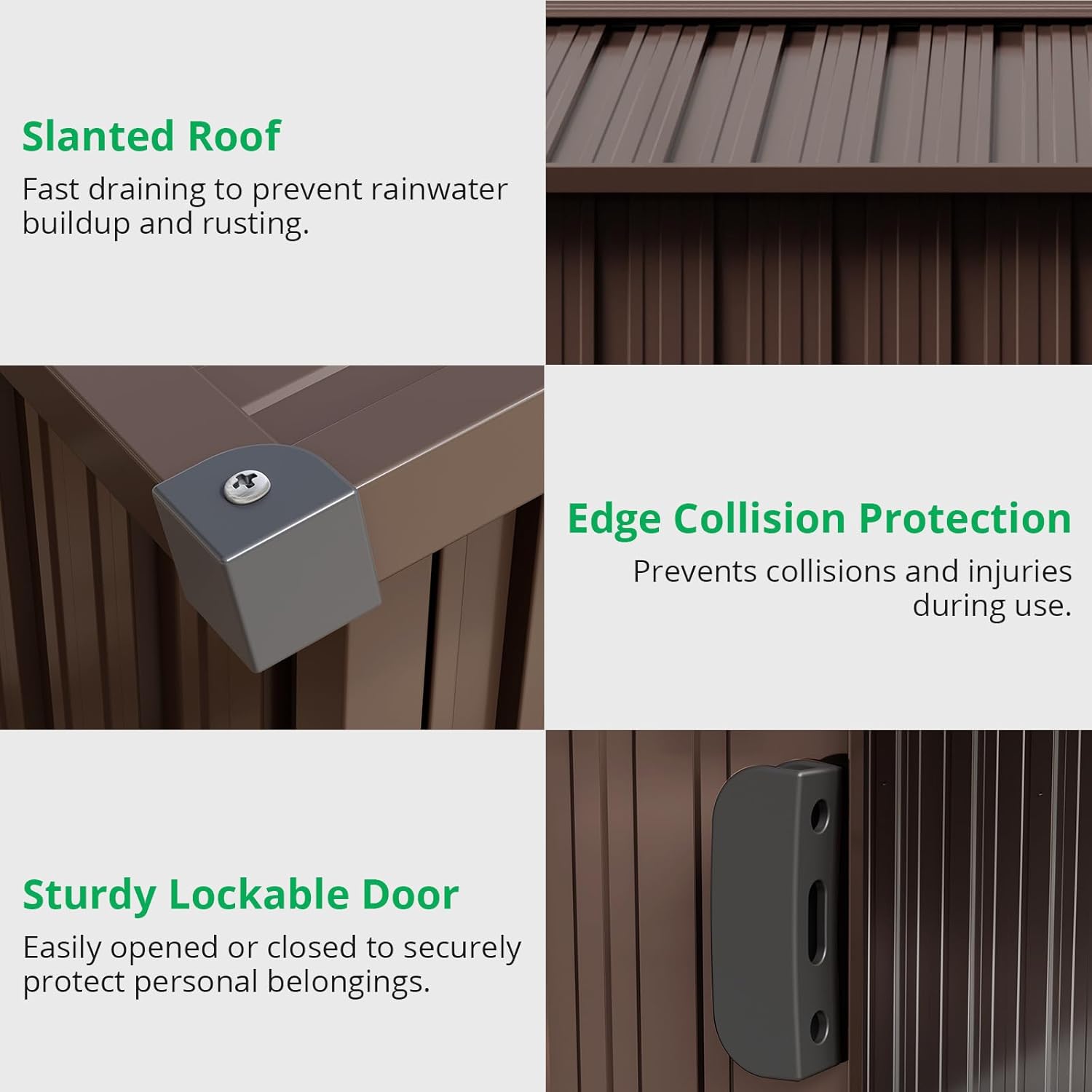 - Ventilated & Sloped Roof Design: Designed with a sloped roof for quick drainage, this patio shed prevents water accumulation and rust. It also features ventilation openings to ensure airflow, keeping the interior dry and preventing mold on your stored items.