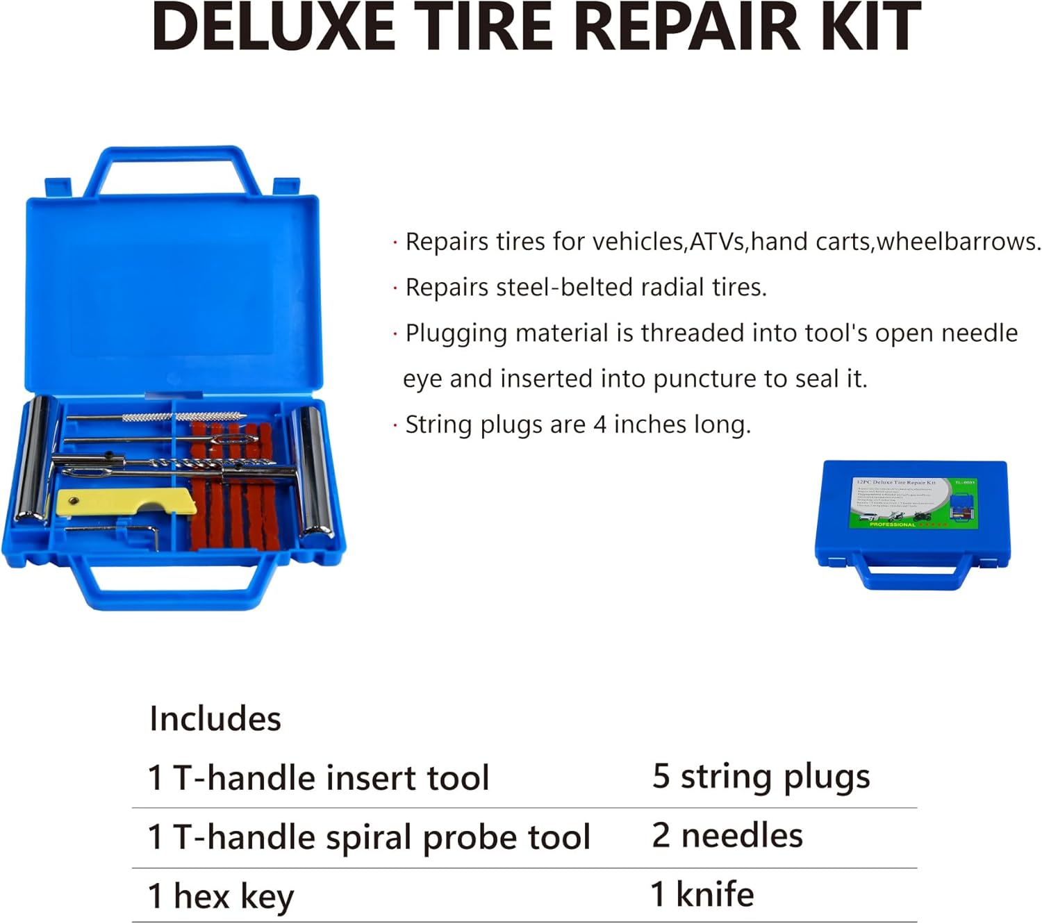 - ăAll Complete Kită Package included: 1 x floor jack(2T) + 2pcs x jack stands(3T) + 12pcs x deluxe tire repair kit. The hydraulic car jack is constructed from high-strength steel, which assures solid structure and outstanding durability for long-term use