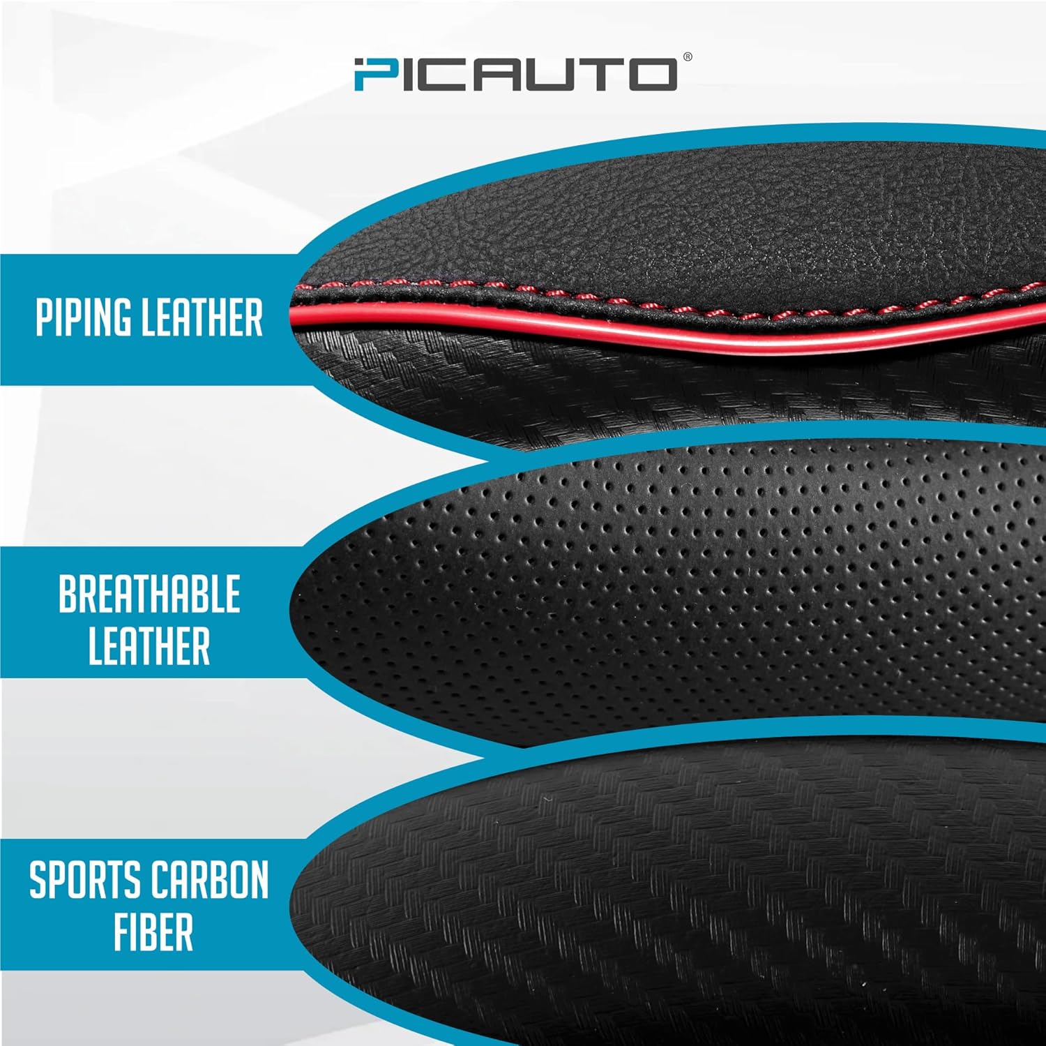 PIC AUTO Steering Wheel Cover, Red Piping Leather, Sports Carbon Fiber and Super Breathable Leather, Universal 14.5-15.5 Inch Anti-Slip Steering Wheels Accessories for Men & Women