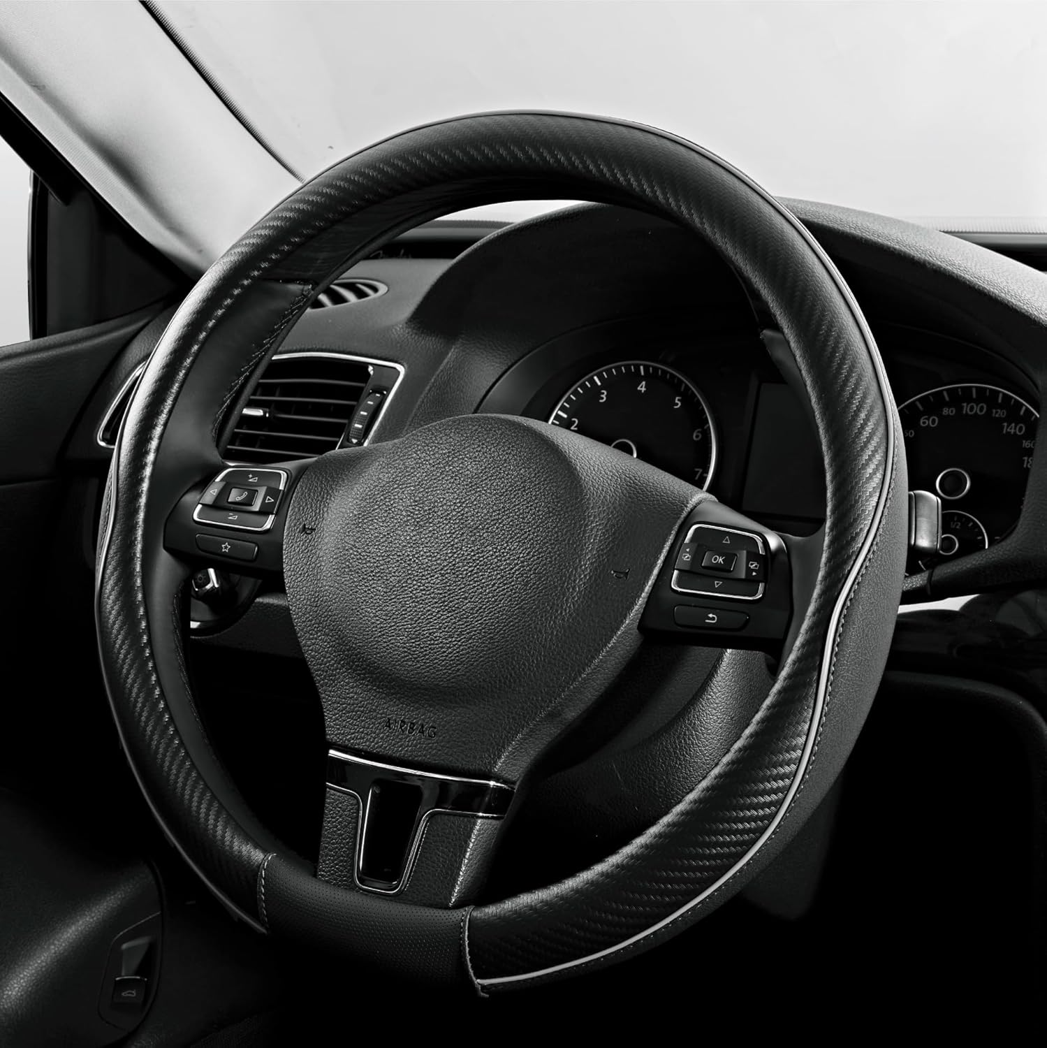 - DESIGN - The stylish piping combined with carbon fiber accents gives the steering wheel cover a sporty and modern look, ideal for drivers who want to add a touch of sophistication and performance to their vehicle’s interior. It’s perfect for those who appreciate both form and function.