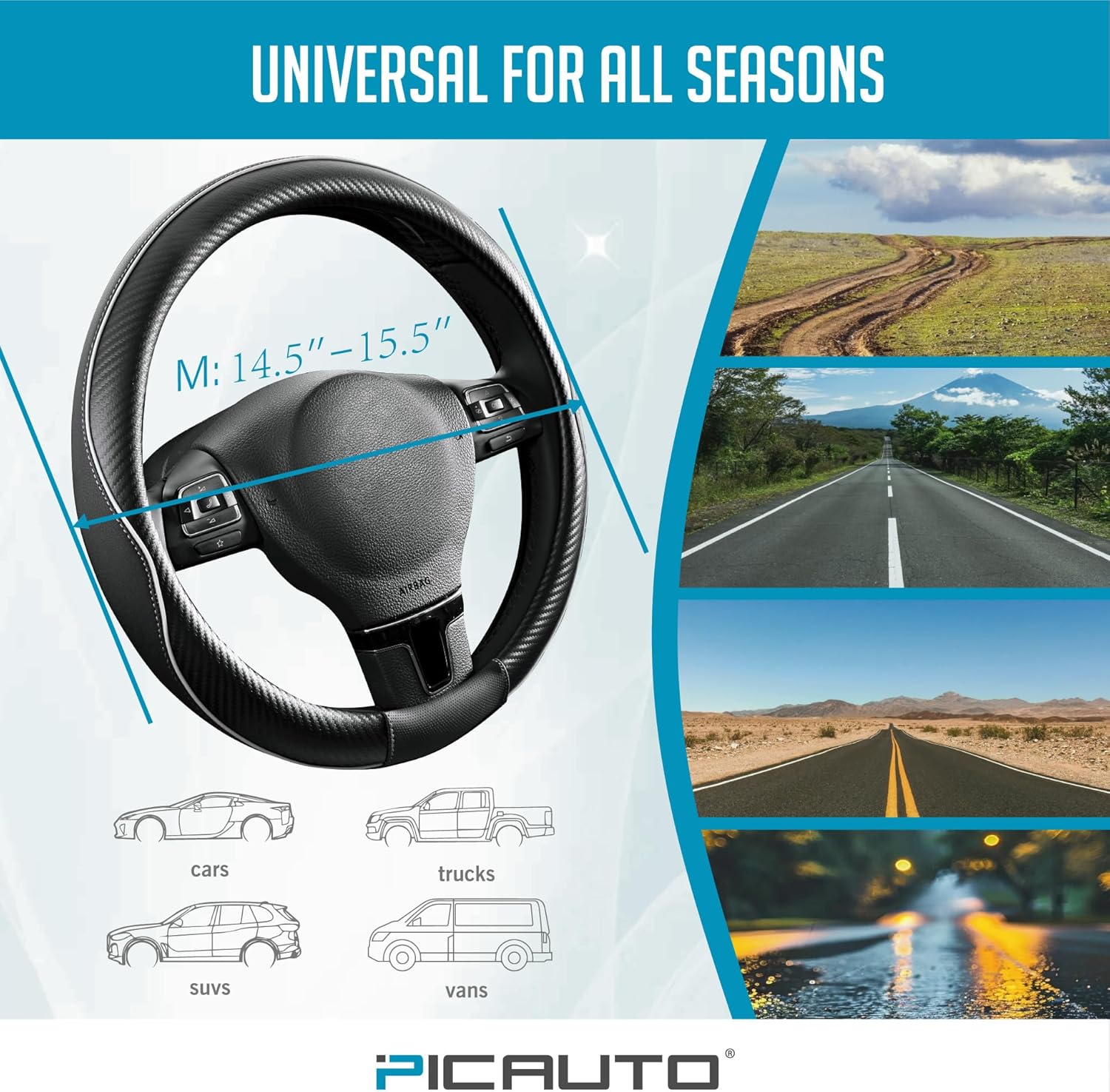 - SIZE - Universally designed to fit steering wheels in the 14.5-15.5 inch range, ensuring compatibility with most cars, trucks, and SUVs. The flexible material makes installation quick and easy, securing the steering wheel cover in place without hassle.