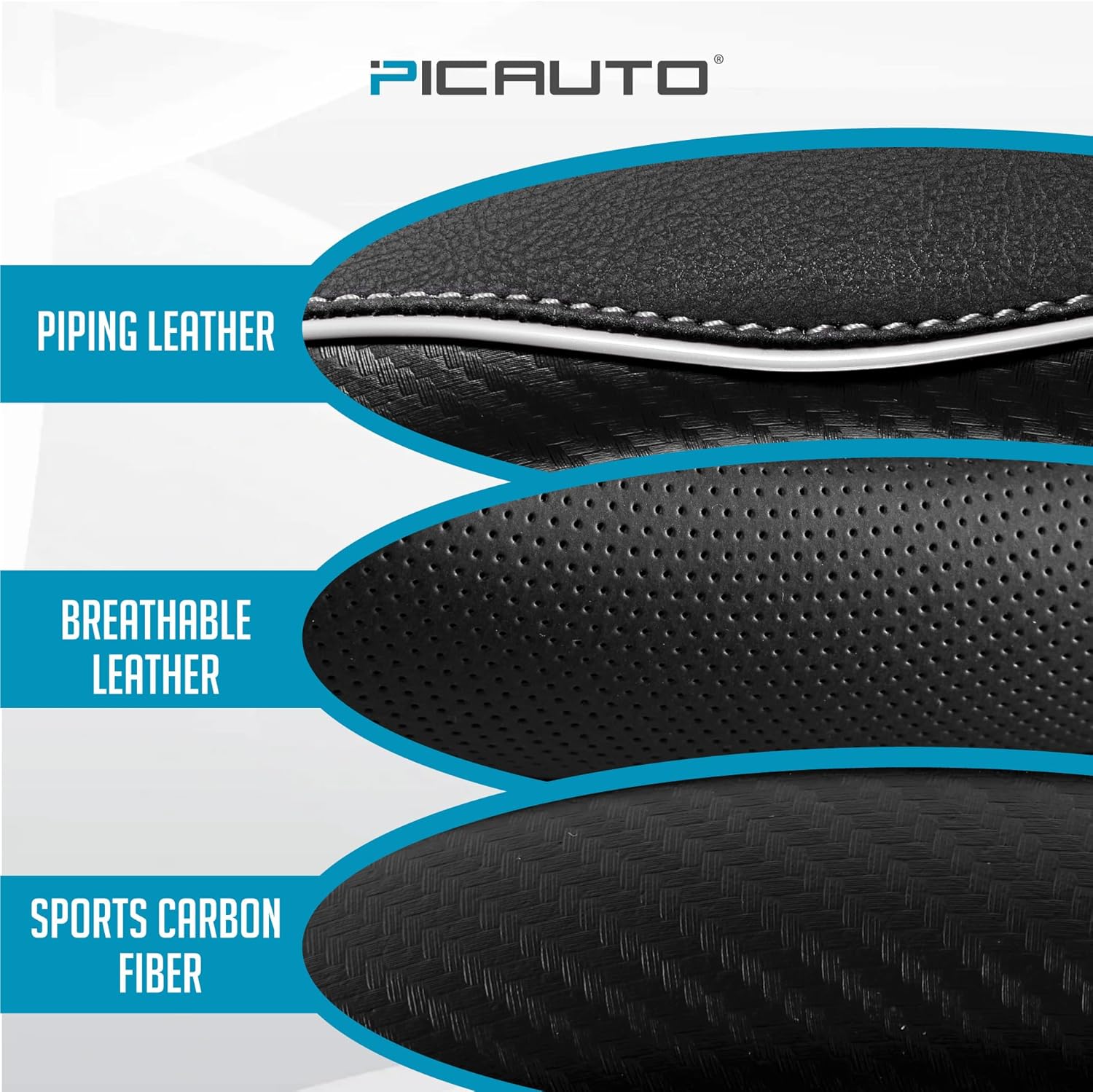 PIC AUTO Steering Wheel Cover, Gray Piping Leather, Sports Carbon Fiber and Super Breathable Leather, Universal 14.5-15.5 Inch Anti-Slip Steering Wheels Accessories for Men & Women