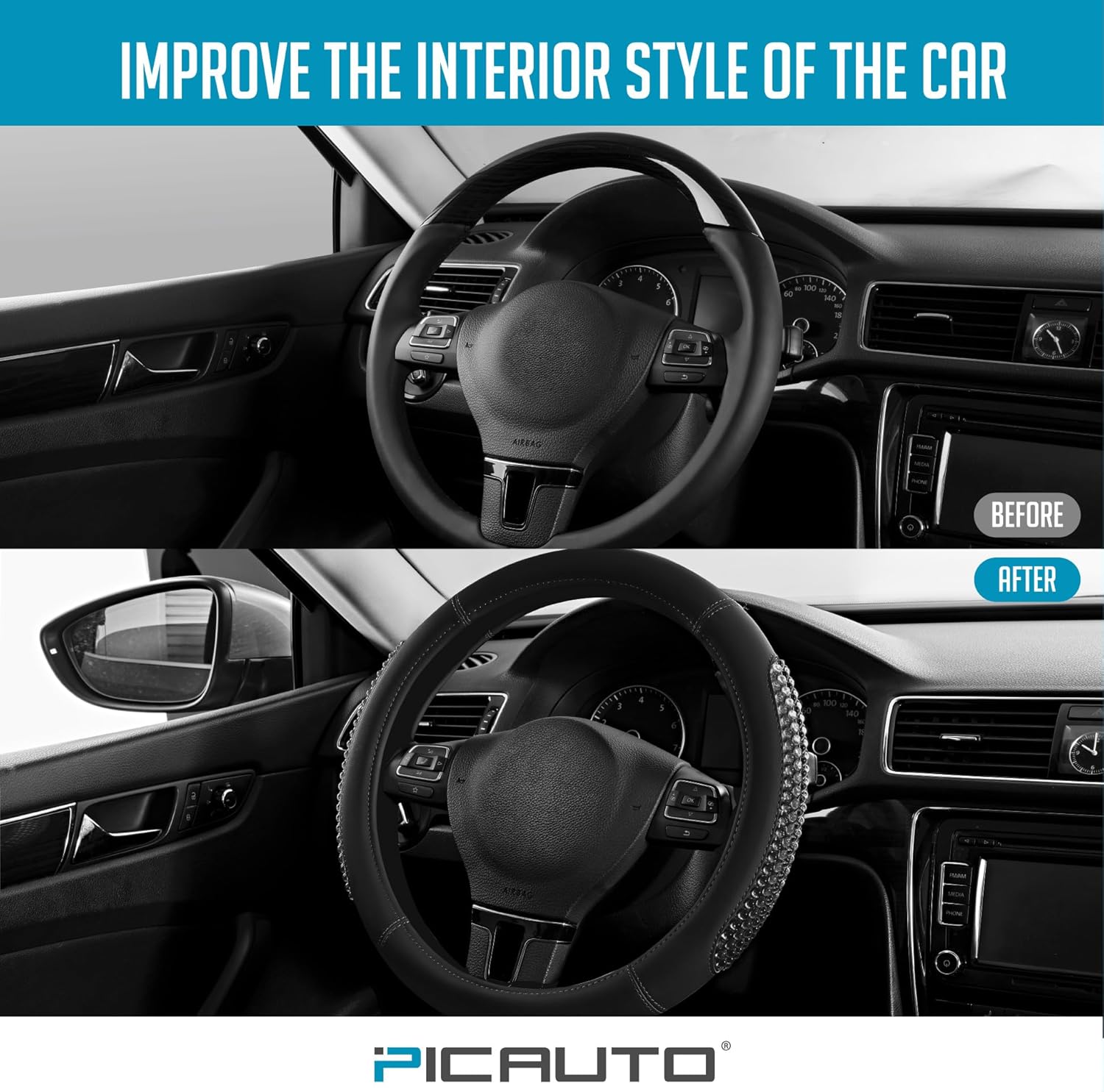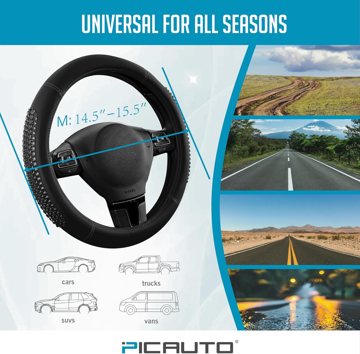 PIC AUTO Gel Particles Steering Wheel Cover, Black Luxury Leather Car Steering Wheel Protector, Universal Fit 14.5"-15.5" Anti-Slip Car Interior Accessories for Girls & Women
