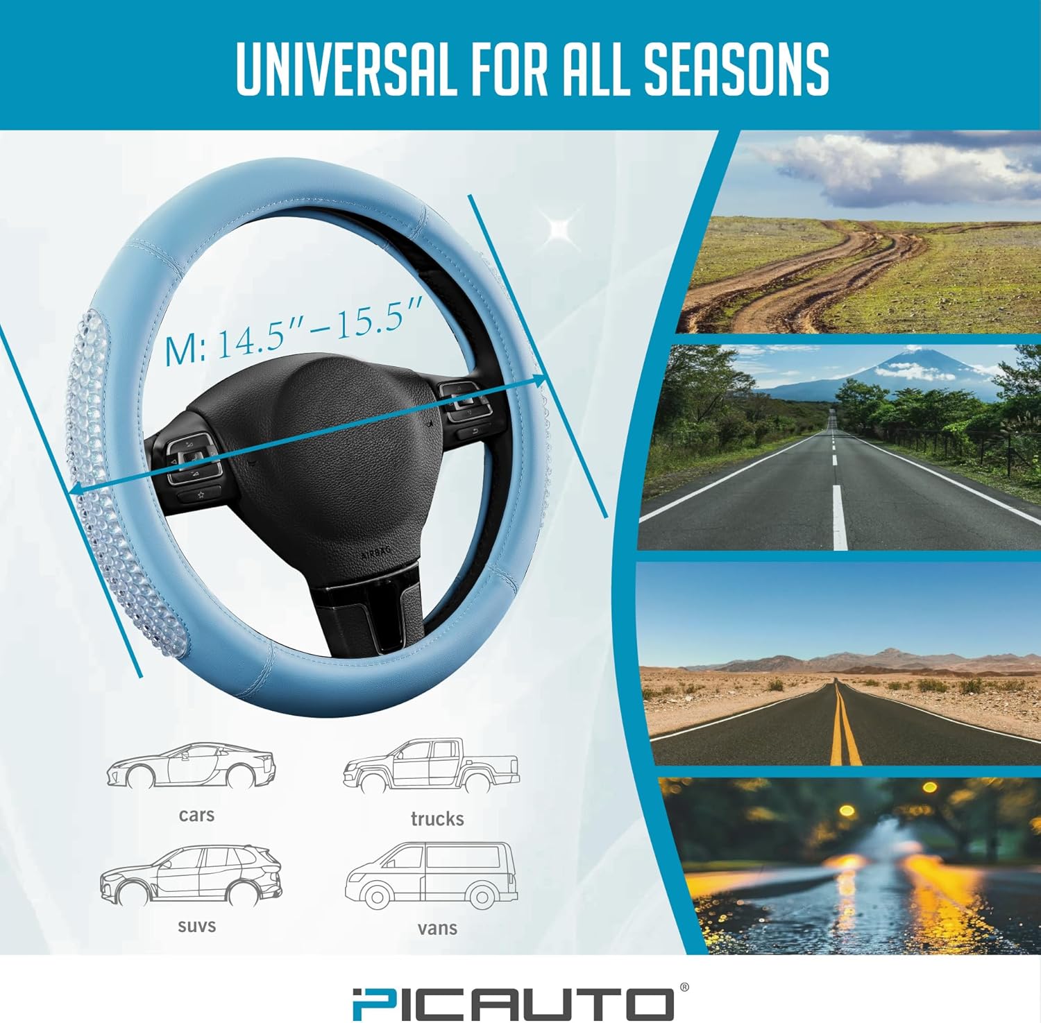 PIC AUTO Gel Particles Steering Wheel Cover, Blue Luxury Leather Car Steering Wheel Protector, Universal Fit 14.5"-15.5" Anti-Slip Car Interior Accessories for Girls & Womenn