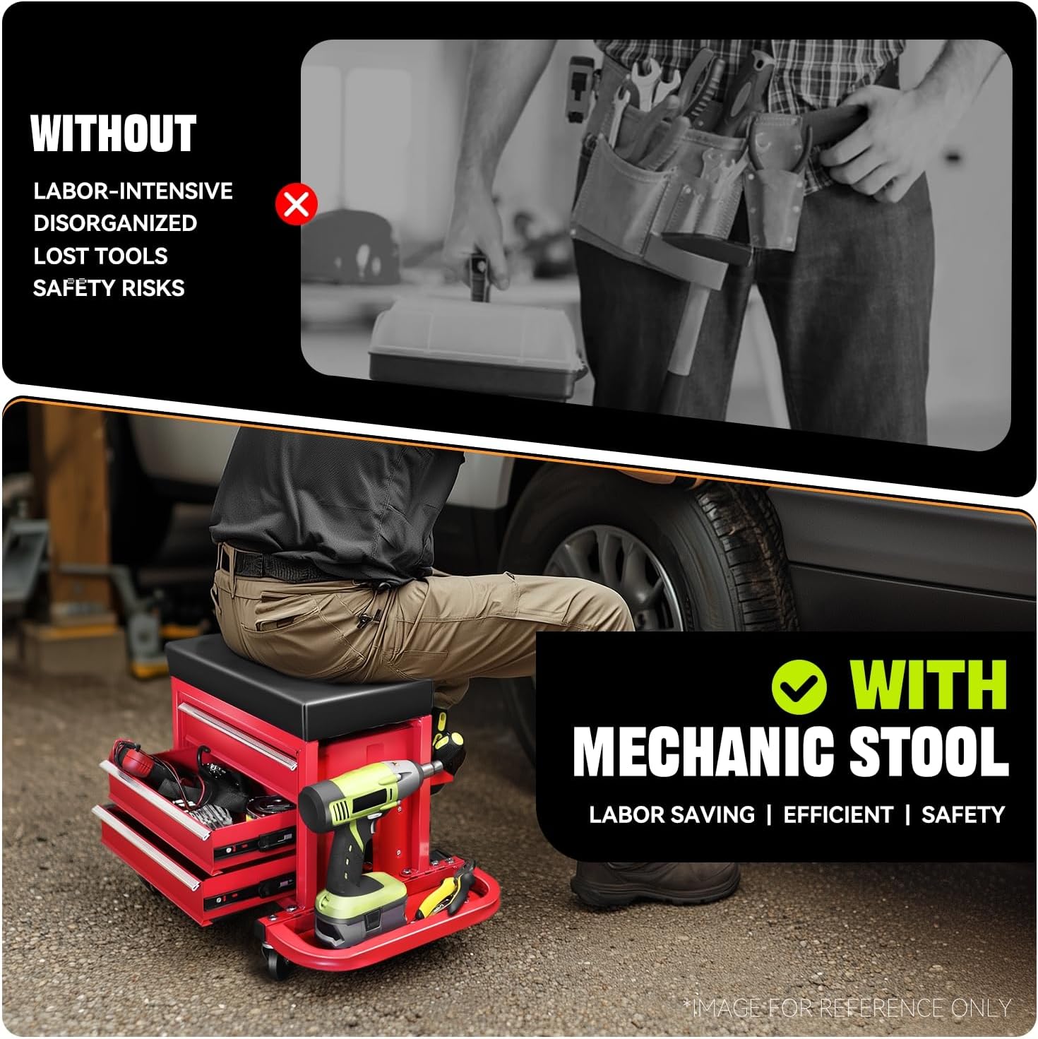- Convenient Storage: This rolling seat has 3 drawers and 2 fold-down side trays, which offer ample storage for small tools and parts. Keep your car care and repair essentials close at hand, allowing you to work more efficiently.
