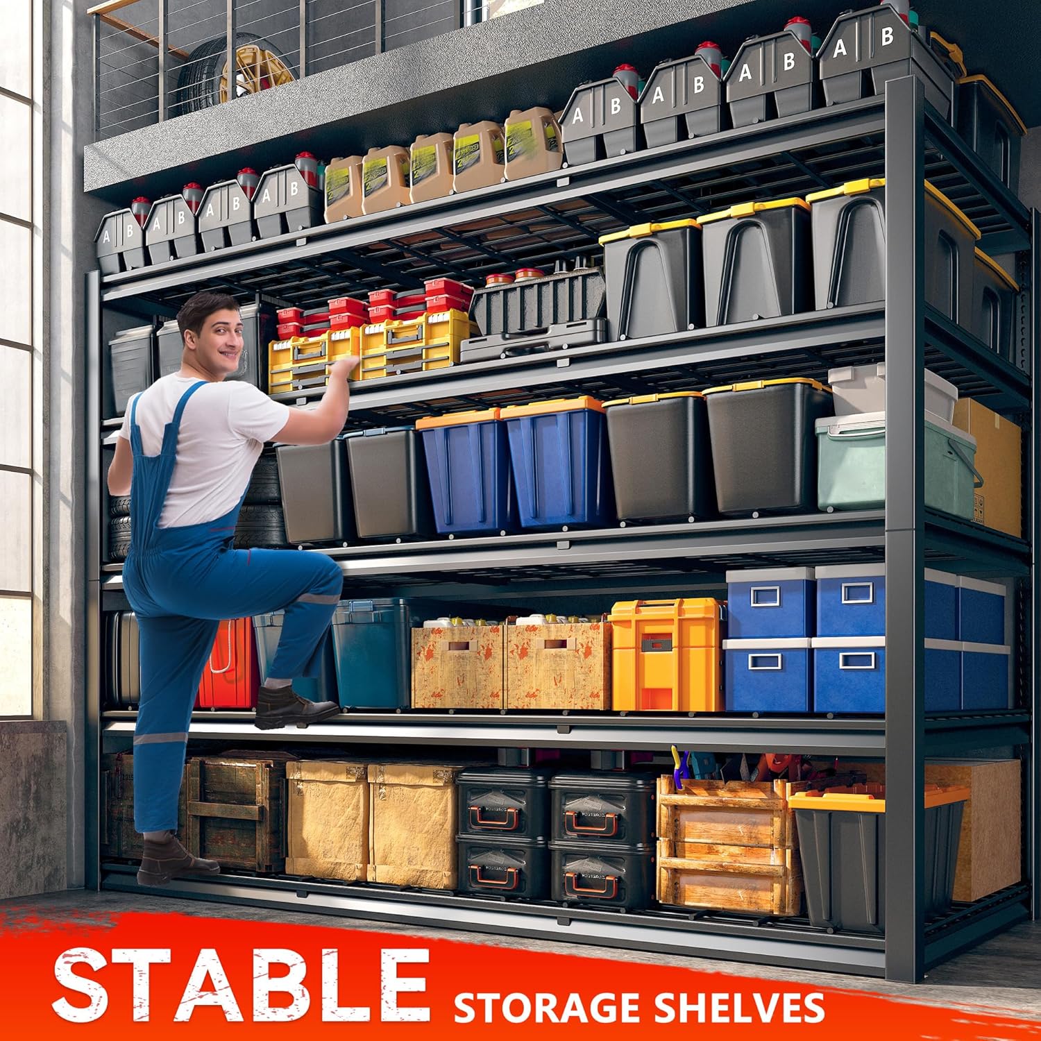 - 【3000LBS Heavy Duty Garage Shelving】REIBII's metal shelving has thickened double metal legs. Each solid thickened metal shelving with 9 big ribs beneath can hold up to 600 lbs, with a total bearing capacity of 3000 lbs, which makes industrial garage shelves more stable and more stuff can be stored