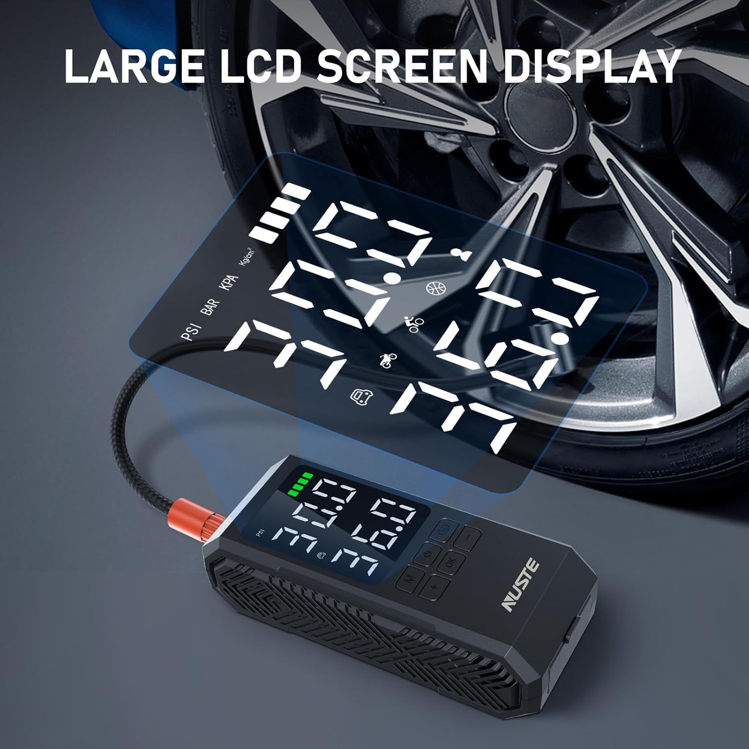 - 150PSl Fast Tire lnflator: NUSTE portable air compressor provides maximum pressure 150 PSl.This bike pump built-in a high-performance chipwhich can quickly inflate tires; lt can fully inflate a car tire in 40 seconds (30-36PSl), or fully inflate in just 5 minutes(0-36PSl)