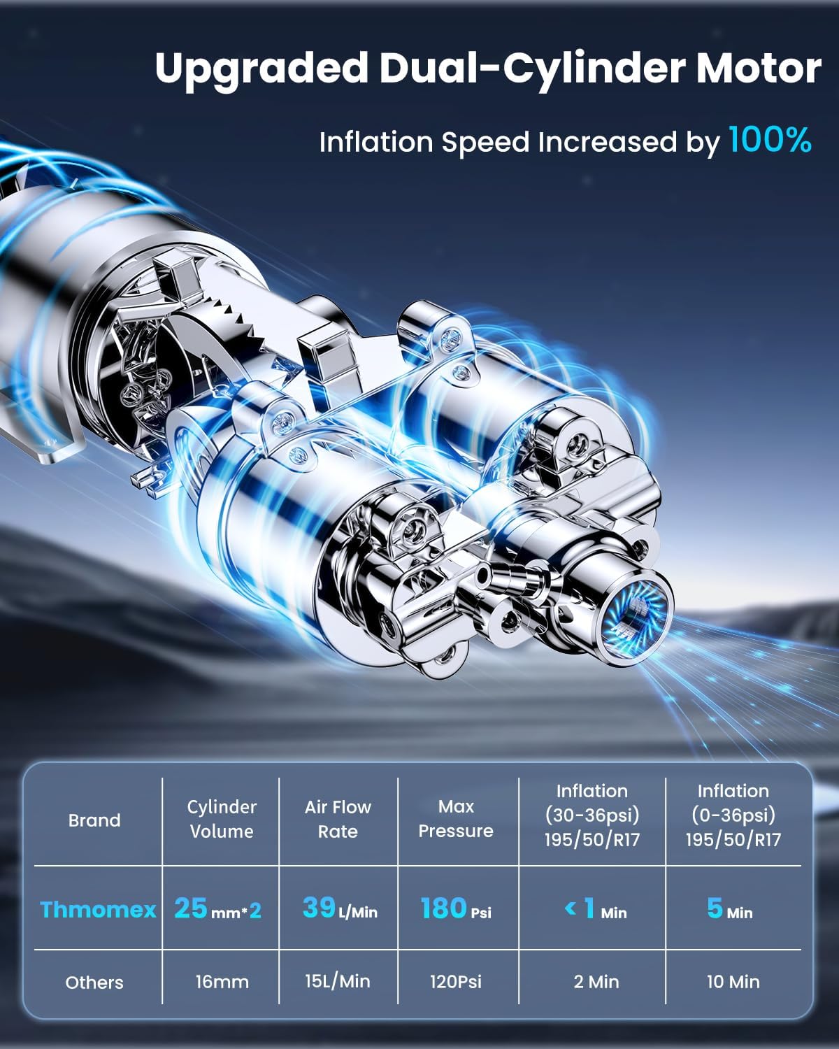 - 【Powerful Dual-Cylinder Design】Thmomex tire inflator is built with a dual-cylinder system, delivering stronger power than standard single-cylinder pumps. It's perfect not only for cars, motorcycles, and bicycles but also for heavy-duty vehicles like trucks, SUVs, and pickups, providing fast, reliable inflation.