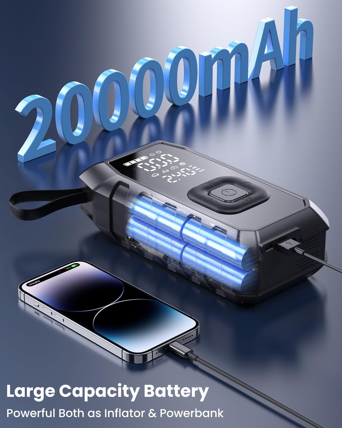 - 【Massive 20,000mAh Battery for Long-Lasting Power】With a full charge, inflate up to 20 tires from 30 PSI to 36 PSI, or fully inflate 4 tires from 0 PSI. Even if the battery runs out, you can use the car cigarette lighter to power the pump, ensuring you're never stranded with a flat.
