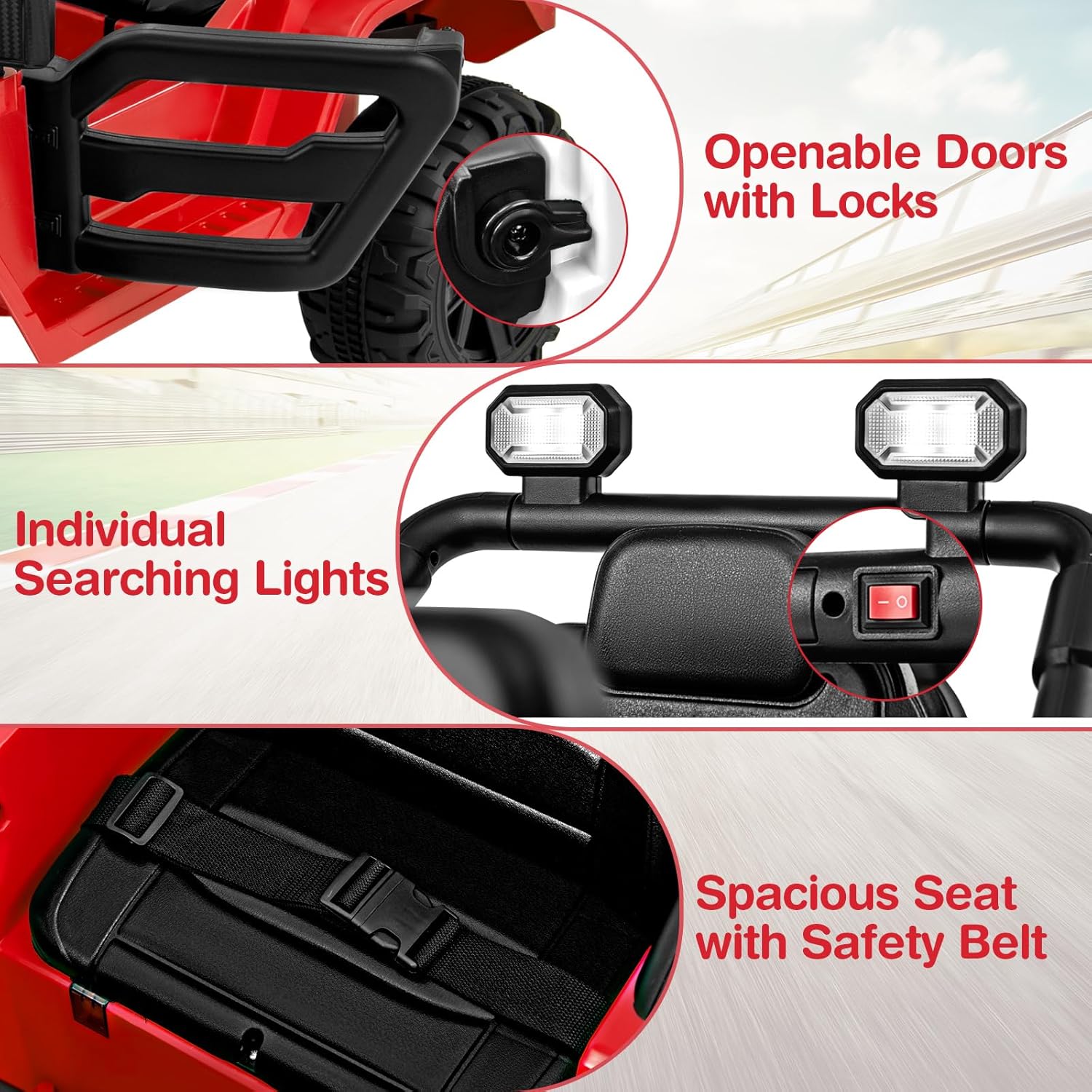 - 【Safe & Reliable Construction】 Constructed from BPA-free material, the electric ride on truck is equipped with adjustable safety belt, lockable doors to ensure durability and safety. It complies with ASTM and CPSIA standards, serving as a reliable and perfect gift for boys and girls over 3 years old.