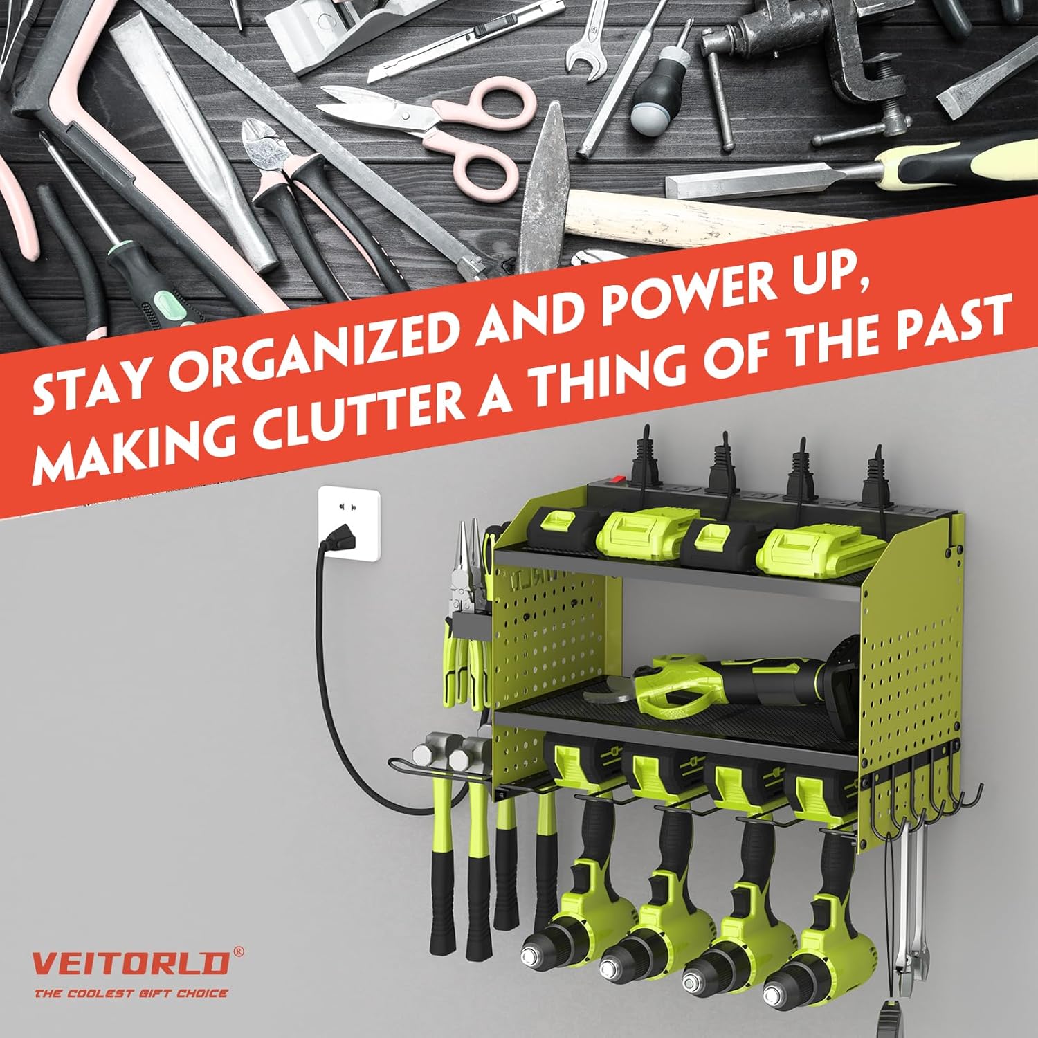 Veitorld Power Tool Organizer with Charging Station, Heavy Duty Modular Wall Mount Rack for Garage - 4 Drill Holders, Tool Storage Organizer, Christmas Birthday Gifts for Men Him Dad Husband