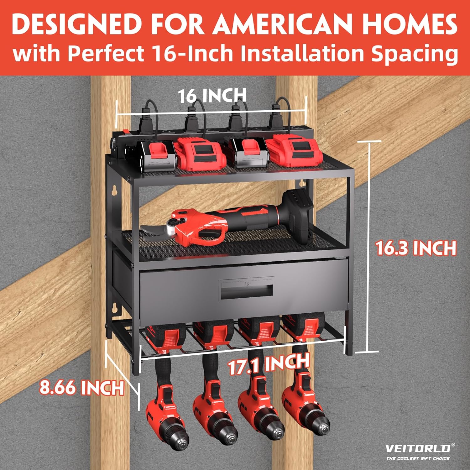 - Efficient Charging Station: Keep your tools ready to go with our integrated power tool organizer wall mount, featuring 8 AC outlets with overload and surge protection. Charge multiple devices simultaneously, boosting your work efficiency
