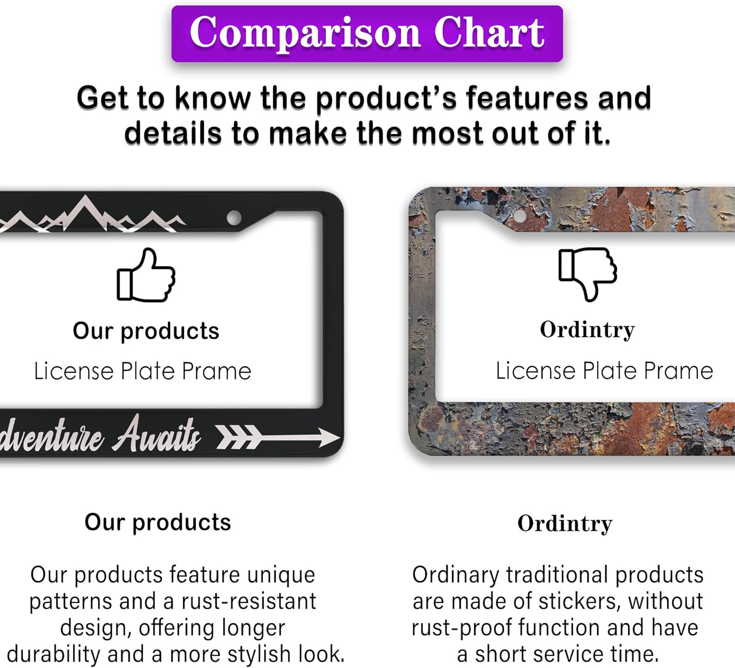 - ALUMINUM FRAME: This License Plate Frame is crafted from high-quality aluminum that is resistant to corrosion, rust, and harsh weather conditions. Its rugged reliability design ensures a long lifespan, making it capable of withstanding car washes and extreme weather, providing you with a reliable and stylish solution for your vehicle.