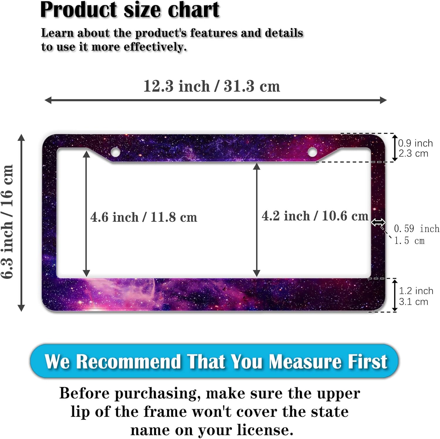 - STANDARD FRAME SIZE: Ensure a perfect fit by checking the dimensions to avoid covering your state name. These frames are specifically designed to fit standard American license plates measuring approximately 12.3" x 6.3" (16 x 31 cm). for most license plates in the U.S.