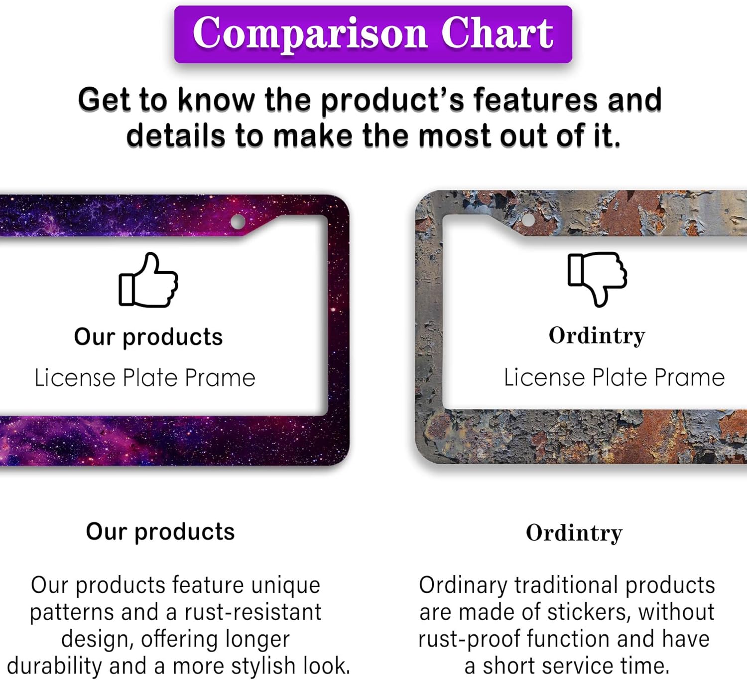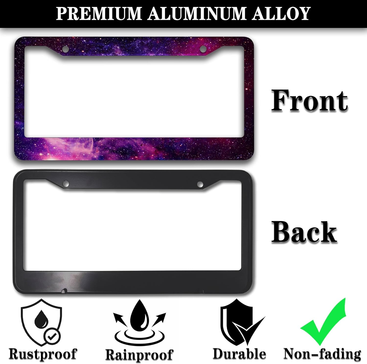 - ALUMINUM FRAME: This License Plate Frame is crafted from high-quality aluminum that is resistant to corrosion, rust, and harsh weather conditions. Its rugged reliability design ensures a long lifespan, making it capable of withstanding car washes and extreme weather, providing you with a reliable and stylish solution for your vehicle.