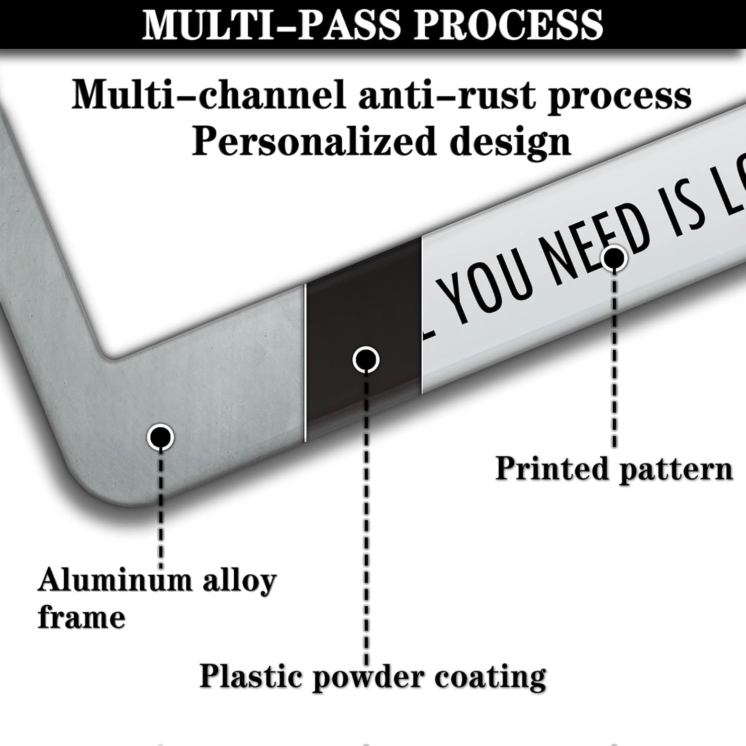 - ALUMINUM FRAME: This License Plate Frame is crafted from high-quality aluminum that is resistant to corrosion, rust, and harsh weather conditions. Its rugged reliability design ensures a long lifespan, making it capable of withstanding car washes and extreme weather, providing you with a reliable and stylish solution for your vehicle.