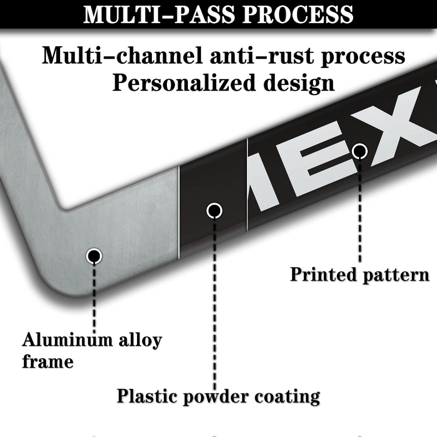 - ALUMINUM FRAME: This License Plate Frame is crafted from high-quality aluminum that is resistant to corrosion, rust, and harsh weather conditions. Its rugged reliability design ensures a long lifespan, making it capable of withstanding car washes and extreme weather, providing you with a reliable and stylish solution for your vehicle.
