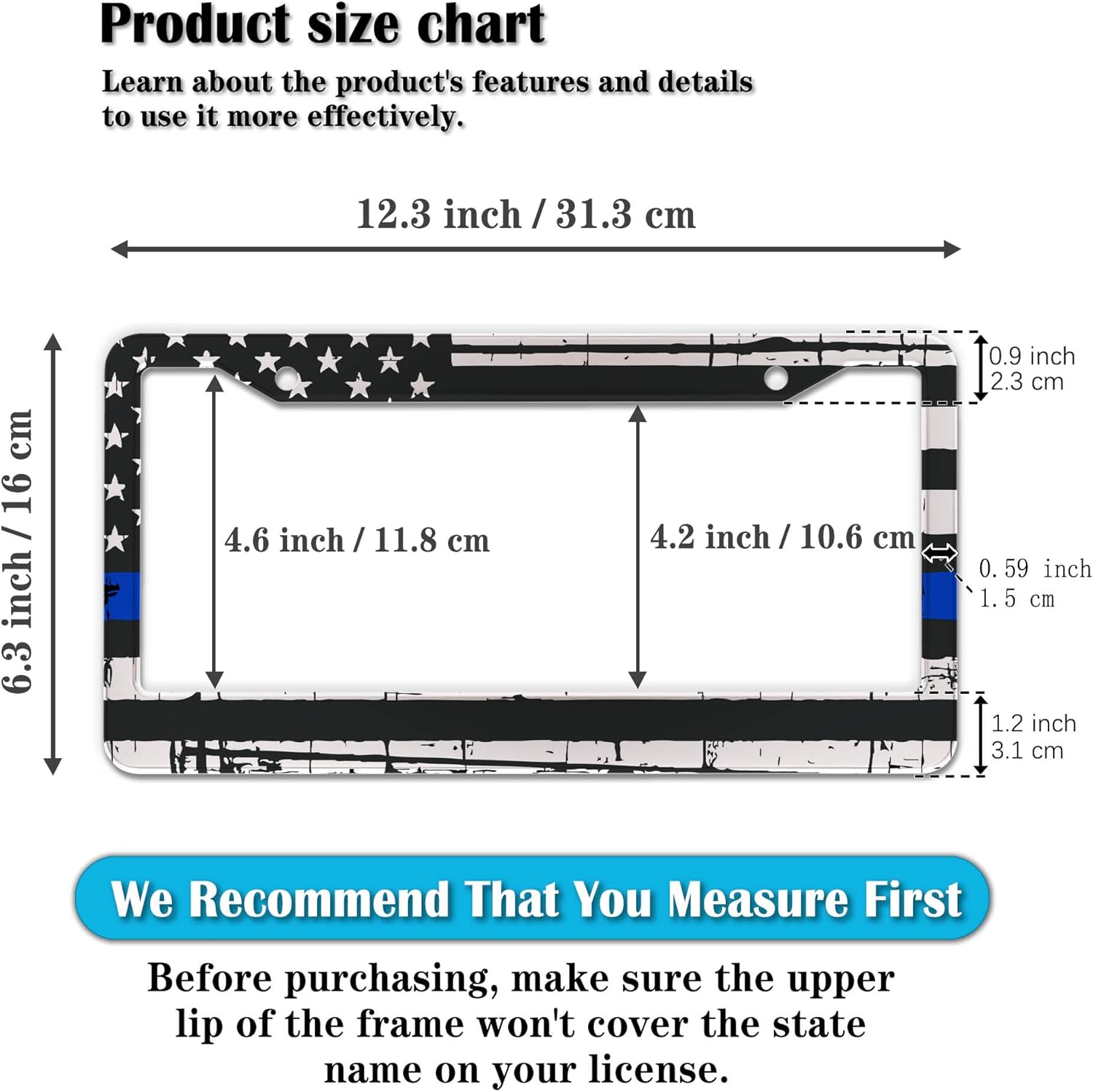 - STANDARD FRAME SIZE: Ensure a perfect fit by checking the dimensions to avoid covering your state name. These frames are specifically designed to fit standard American license plates measuring approximately 12.3" x 6.3" (16 x 31 cm). for most license plates in the U.S.