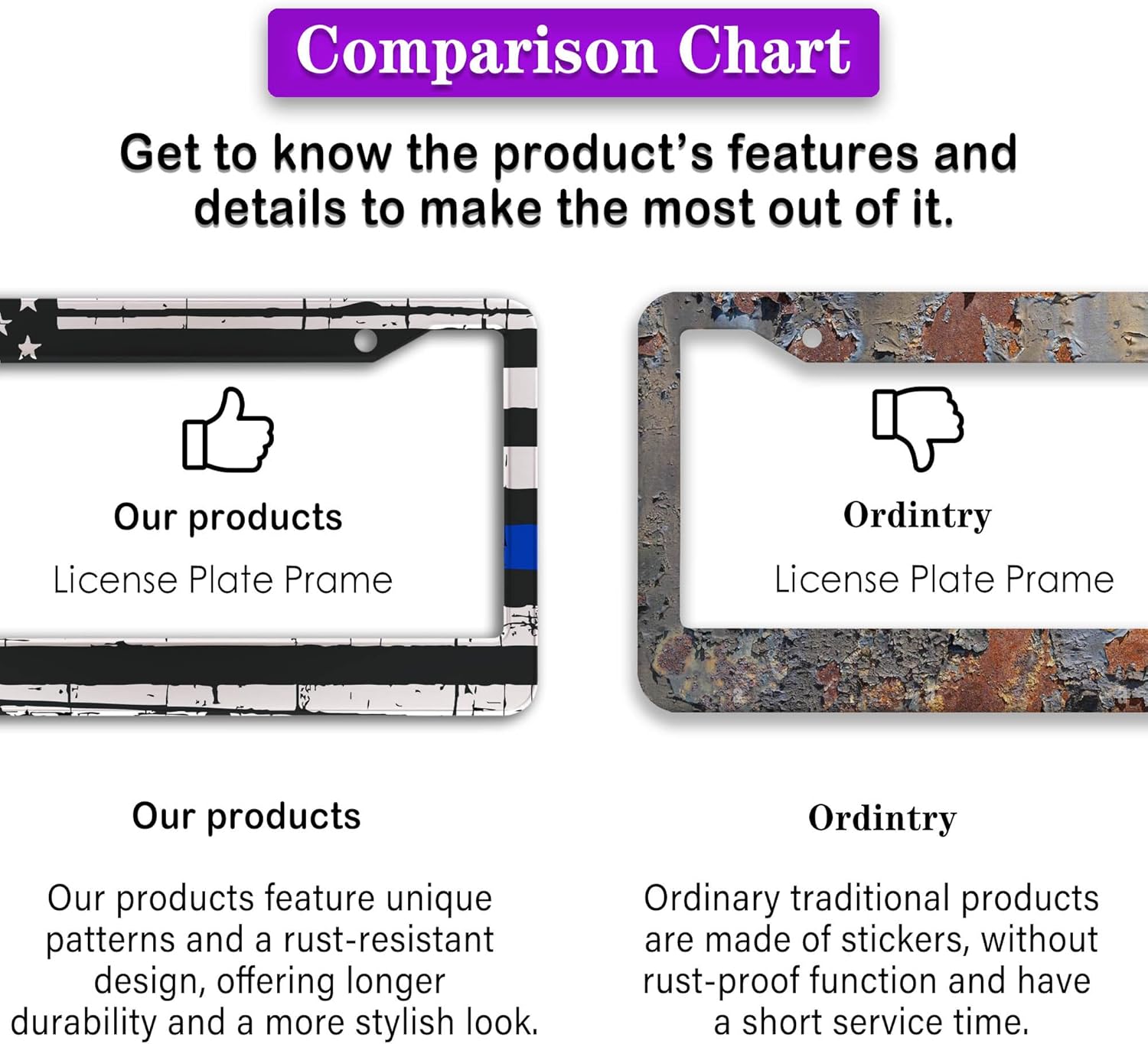 - ALUMINUM FRAME: This License Plate Frame is crafted from high-quality aluminum that is resistant to corrosion, rust, and harsh weather conditions. Its rugged reliability design ensures a long lifespan, making it capable of withstanding car washes and extreme weather, providing you with a reliable and stylish solution for your vehicle.