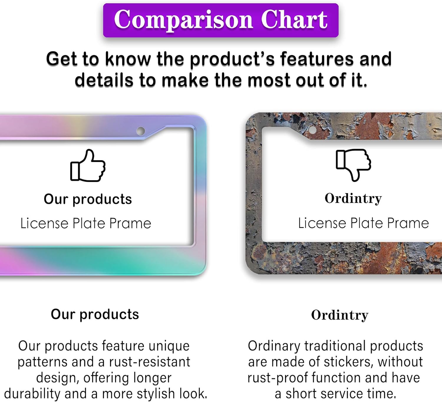- ALUMINUM FRAME: This License Plate Frame is crafted from high-quality aluminum that is resistant to corrosion, rust, and harsh weather conditions. Its rugged reliability design ensures a long lifespan, making it capable of withstanding car washes and extreme weather, providing you with a reliable and stylish solution for your vehicle.