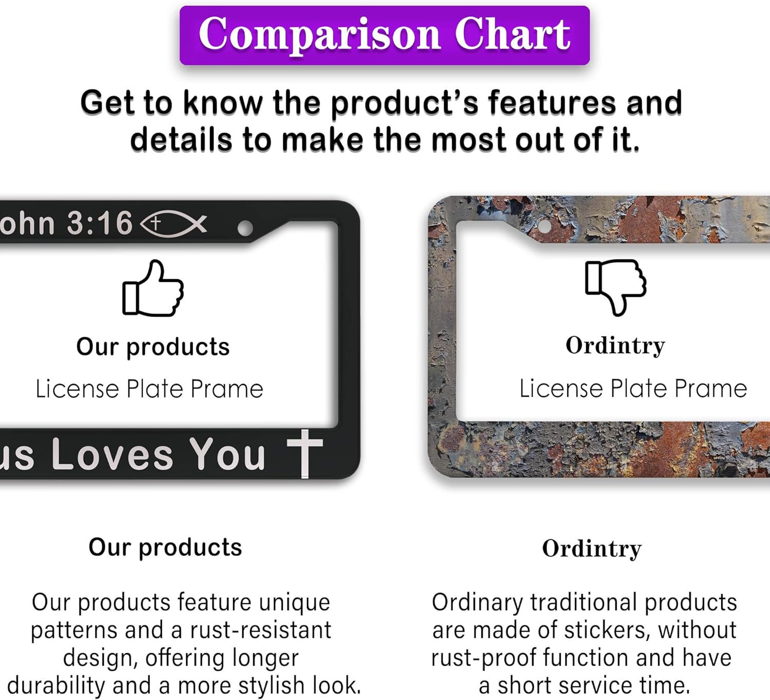 - ALUMINUM FRAME: This License Plate Frame is crafted from high-quality aluminum that is resistant to corrosion, rust, and harsh weather conditions. Its rugged reliability design ensures a long lifespan, making it capable of withstanding car washes and extreme weather, providing you with a reliable and stylish solution for your vehicle.