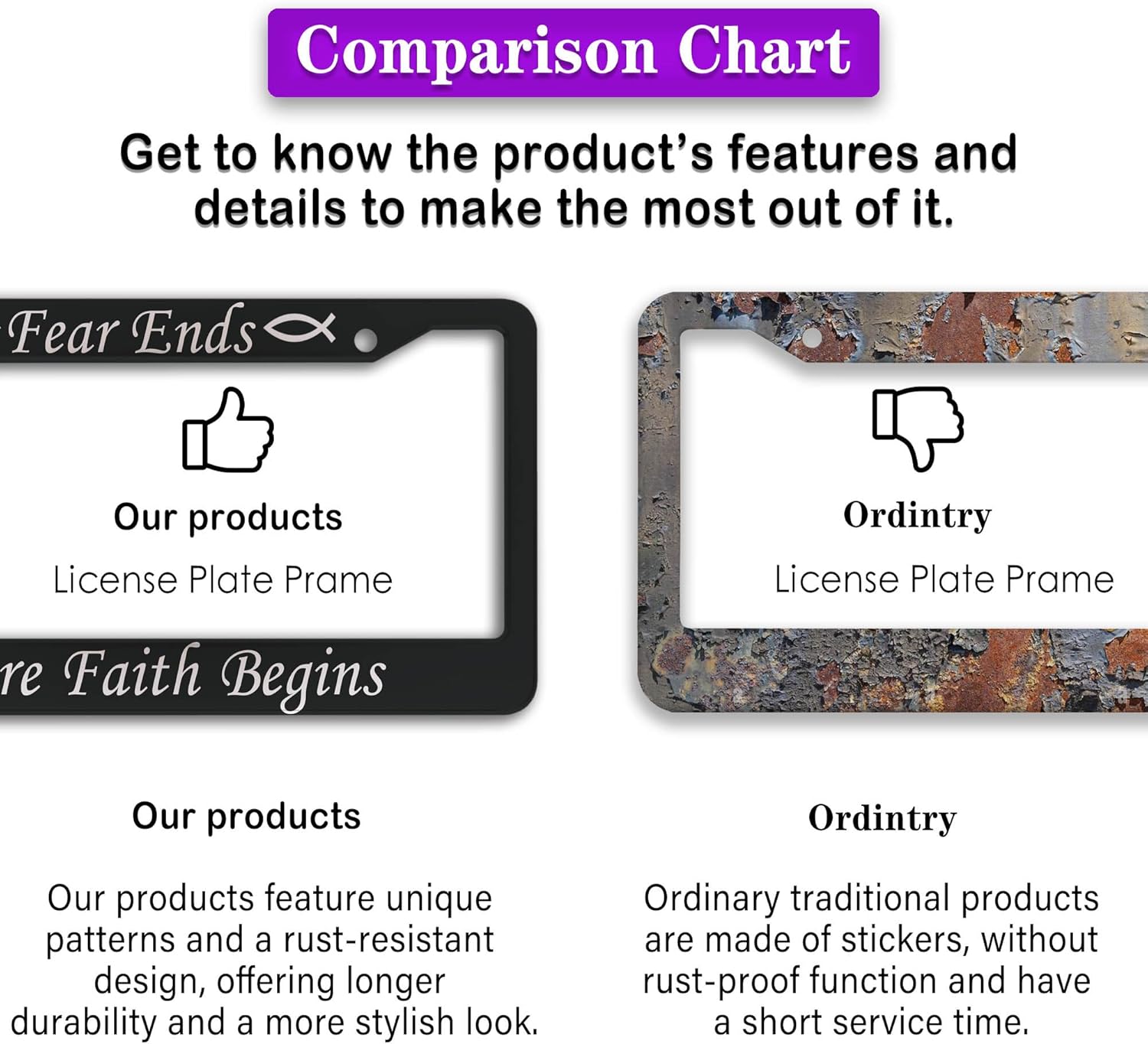 - ALUMINUM FRAME: This License Plate Frame is crafted from high-quality aluminum that is resistant to corrosion, rust, and harsh weather conditions. Its rugged reliability design ensures a long lifespan, making it capable of withstanding car washes and extreme weather, providing you with a reliable and stylish solution for your vehicle.