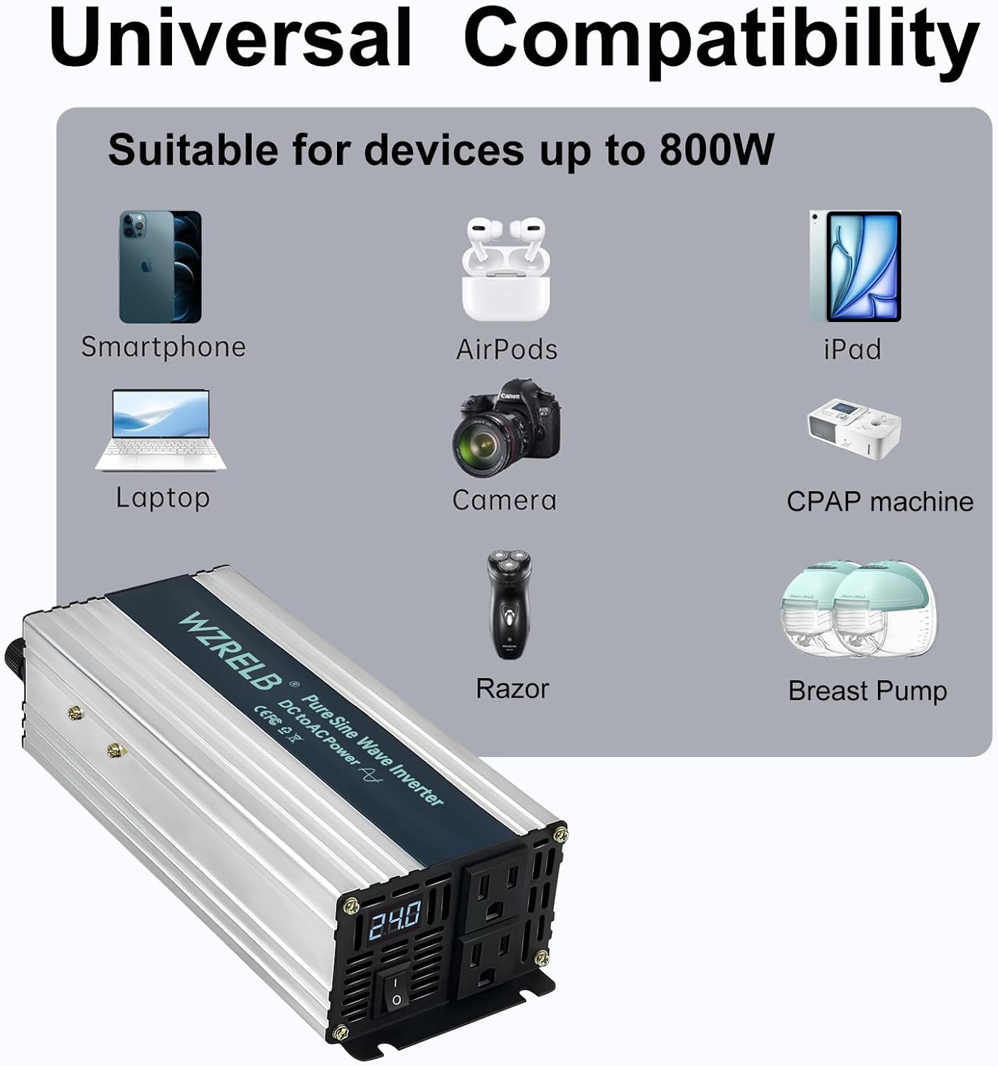 WZRELB 800W Pure Sine Wave Inverter 24V DC to 110V 120V AC Power Converter with LED Display, Off-Grid Portable Power Inverter with 2 AC Outlets for Home, RV, Truck, Camping