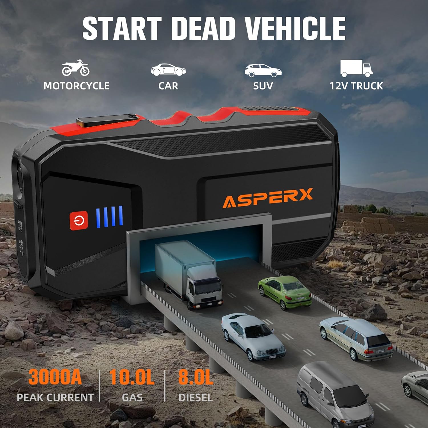 - ă3000A Jump Starteră The ASPERX 3000A car battery jump starter can effortlessly jump-start 10L gas or 8.0L diesel engines in mere seconds. When the battery has sufficient charge, the car jump starter can quickly provide enough cranking amperage to the car battery, ensuring that the vehicle starts up within a short period of time.Even if your battery's voltage dips too low (below 9V), simply pressing the "BOOST" button will get your engine running again. Widely supports various car models.