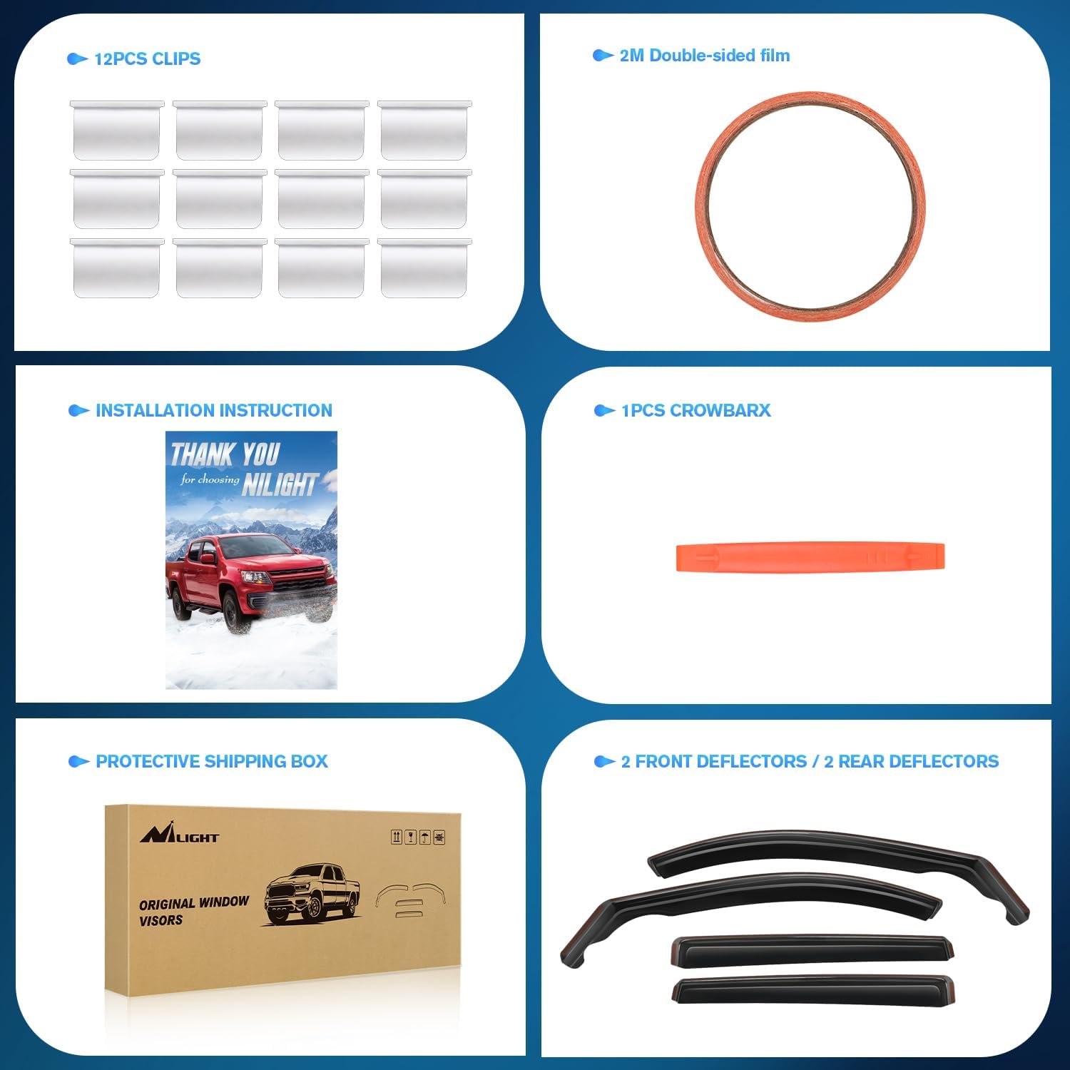 - Advantage:Nilight window deflectors are great for all weather conditions,help improve ventilation inside and outside your car to reduce mirror and window fogging while increasing air circulation。With our side window deflectors, it deflects the rain and noise away from your windows to make your driving more enjoyable
