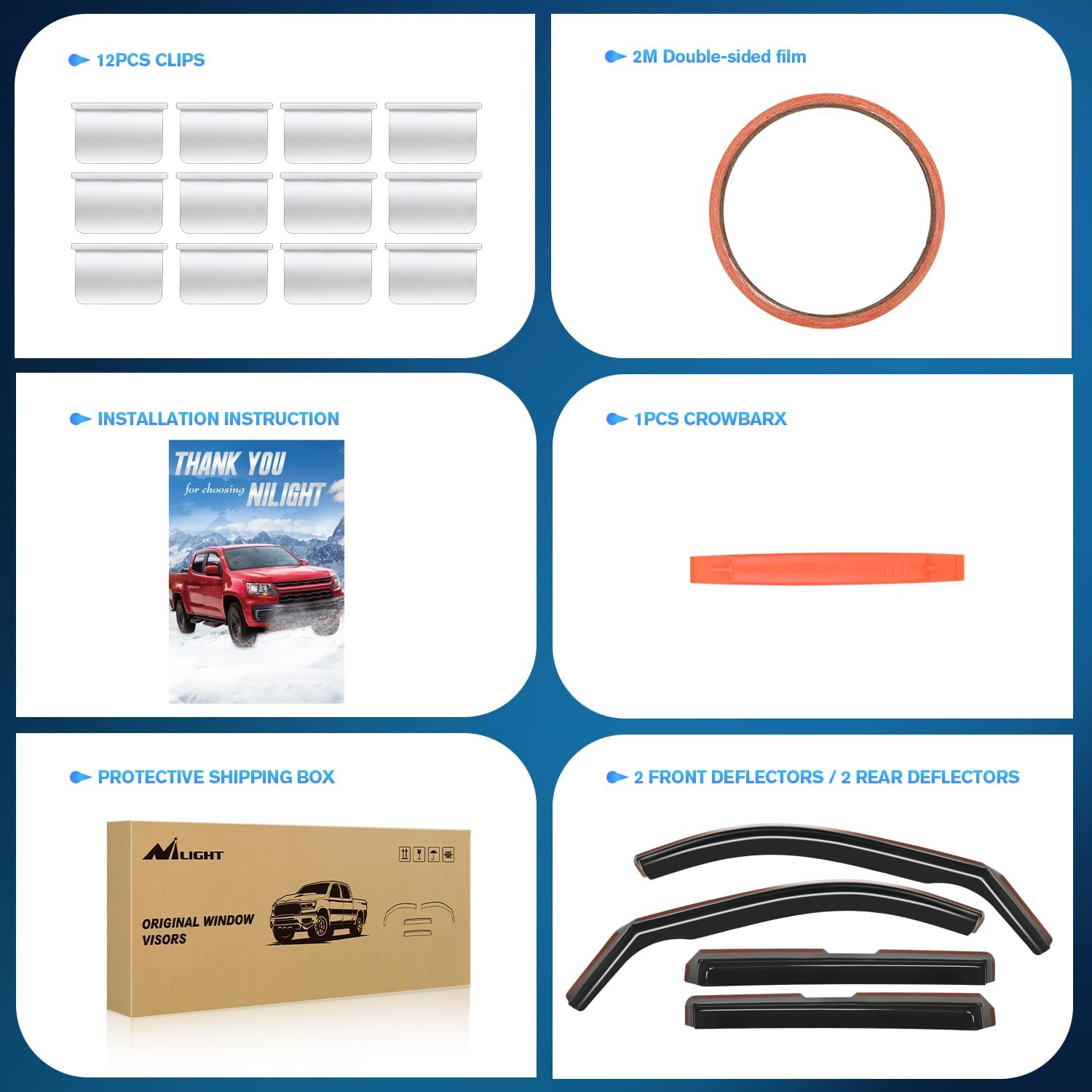 - Advantage:Nilight window deflectors are great for all weather conditions,help improve ventilation inside and outside your car to reduce mirror and window fogging while increasing air circulation。With our side window deflectors, it deflects the rain and noise away from your windows to make your driving more enjoyable