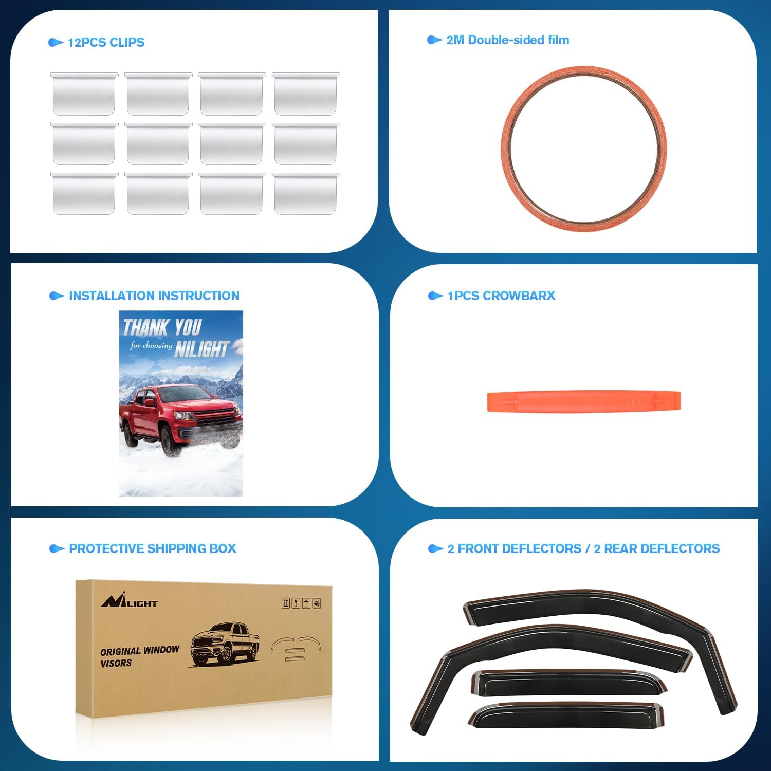 - PERFECT FIT:Window Deflectors made with tough and shatterproof premium-quality acrylic, will not easy bend, break or crack.Designed with precise engineering data to ensure custom fit to your vehicle.Reduce interior wind noise and reduce glare during night driving.