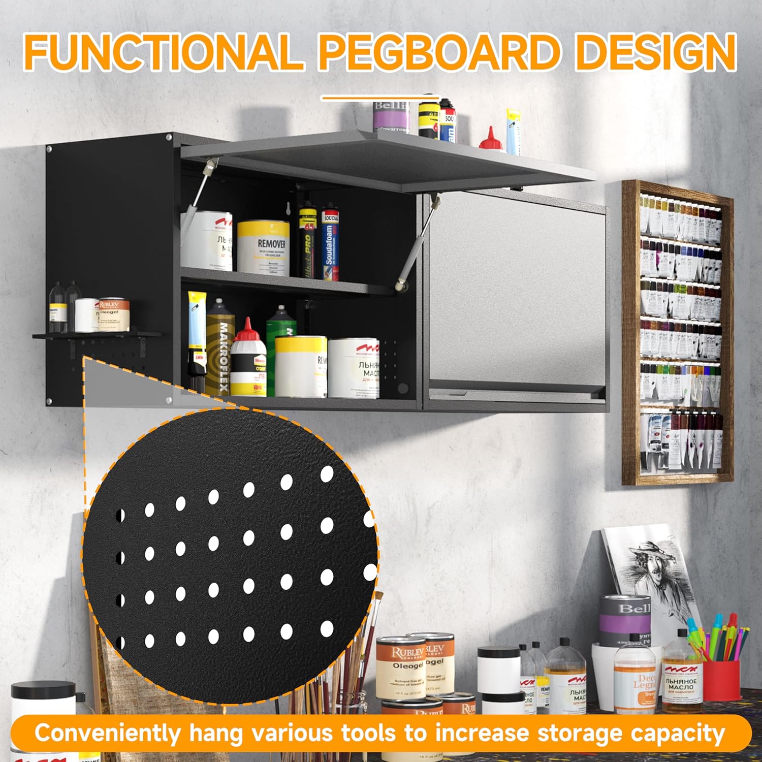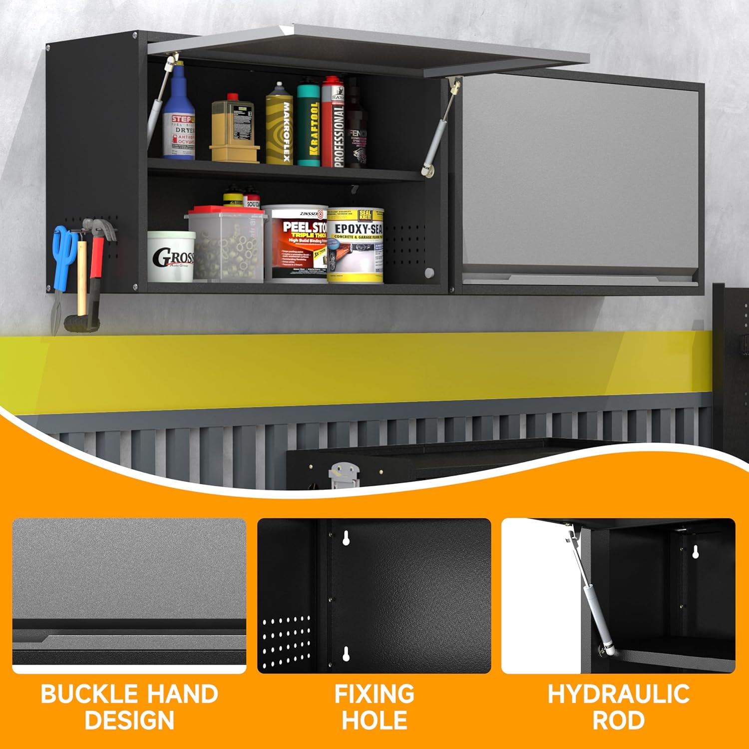 - 🌈【HYDRAULIC-OPENING DOOR】The door of the floating garage tool cabinet has a hydraulic lever with an upward opening design that opens and closes at an angle of 90 degrees, the hydraulic-rod to keep the door up so that free your hands while you put in or take out items. Each corner features a mounting hole, allowing this wall storage cabinet to be firmly fixed to the wall without any risk of falling.